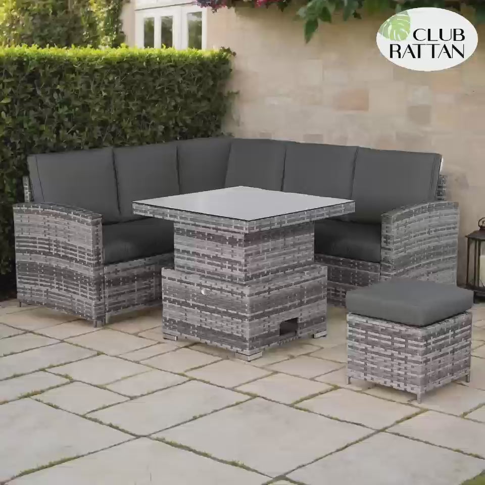 This classic high back compact corner sofa set with rising table sits 6 people properly . It’s made in our premium dark grey rattan that will withstand our British weather of rain, wind and sun. The dark grey cushions are super thick with solid foam insert and comfortable. Now sit down and enjoy... maybe with a nice cold one? |