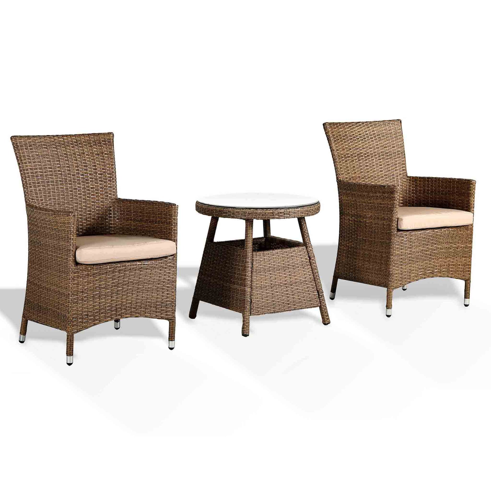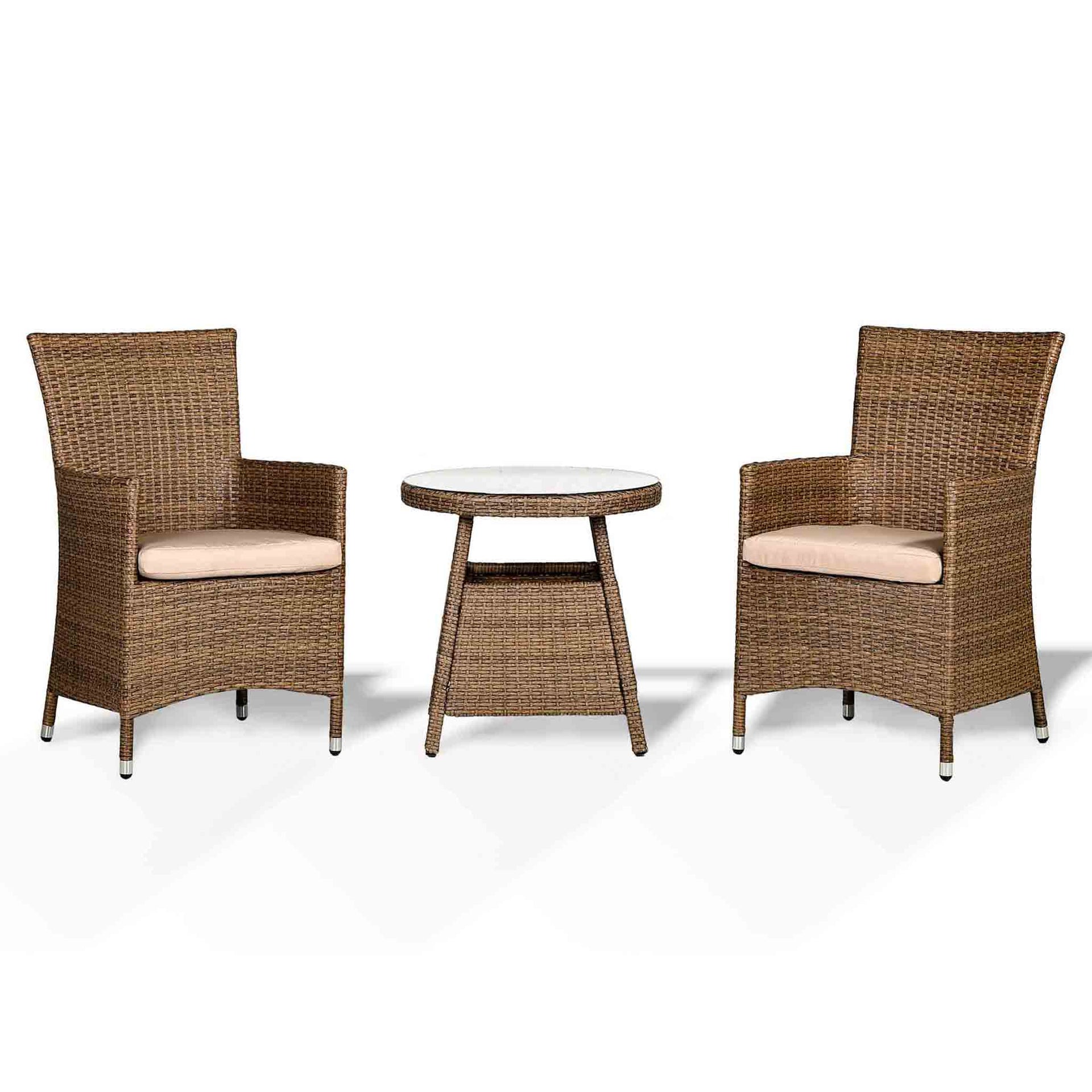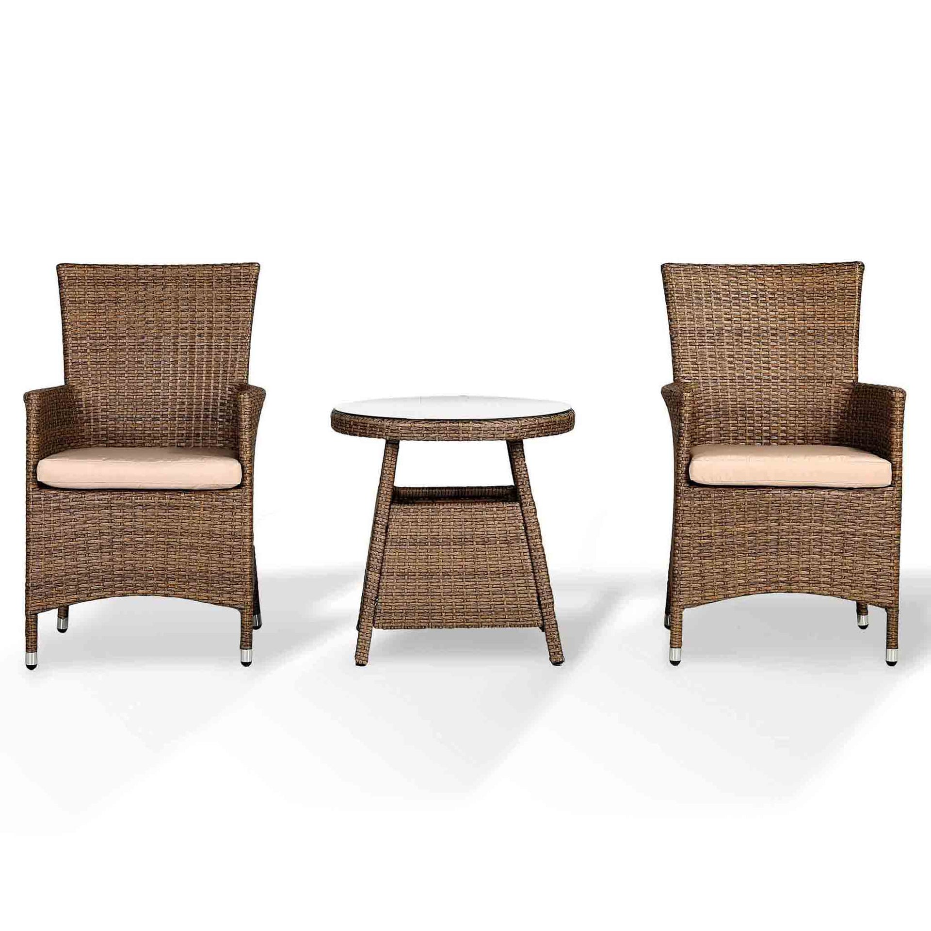 With a natural brown rattan that provides a modern look, this stylish bistro set will look fabulous in any garden. The chairs can also be used as dining chairs alongside our corner sofa with dining table sets in the same matching rattan. Our plush beige cushions are of premium quality, ensuring you the utmost comfort for you to sit back and soak up the cosy warmth of the sun until it disappears behind the horizon. Underneath the 6mm tempered glass top is a fully weaved table for a smooth, luxury look. Whilst the table requires a little bit of easy self-assembly, the chairs are fully assembled for your own convenience. Find that sun trap and enjoy a nice drink! With over two decades of experience, we’ve dedicated our time to not only sourcing the best materials but extensively developing our stylish models. |