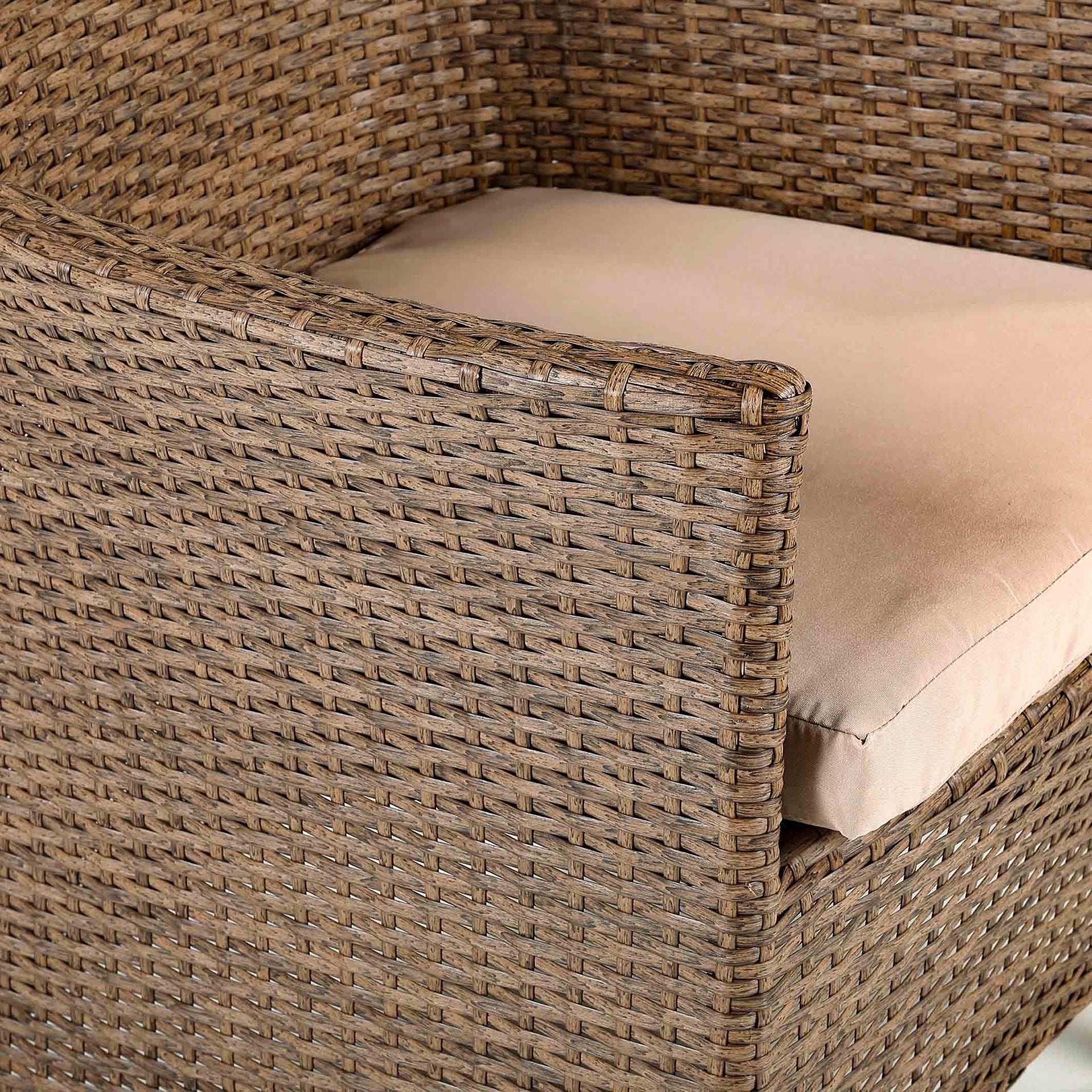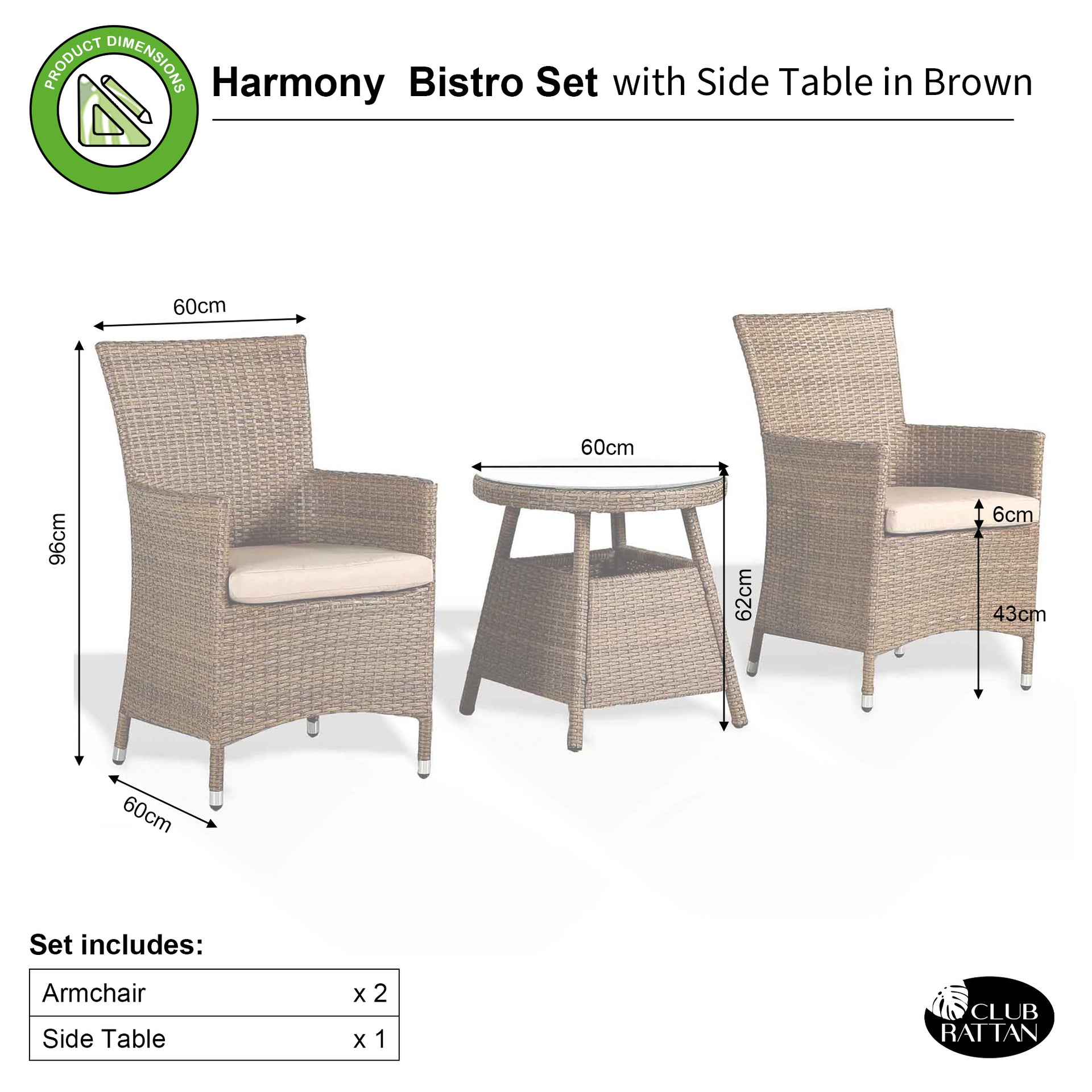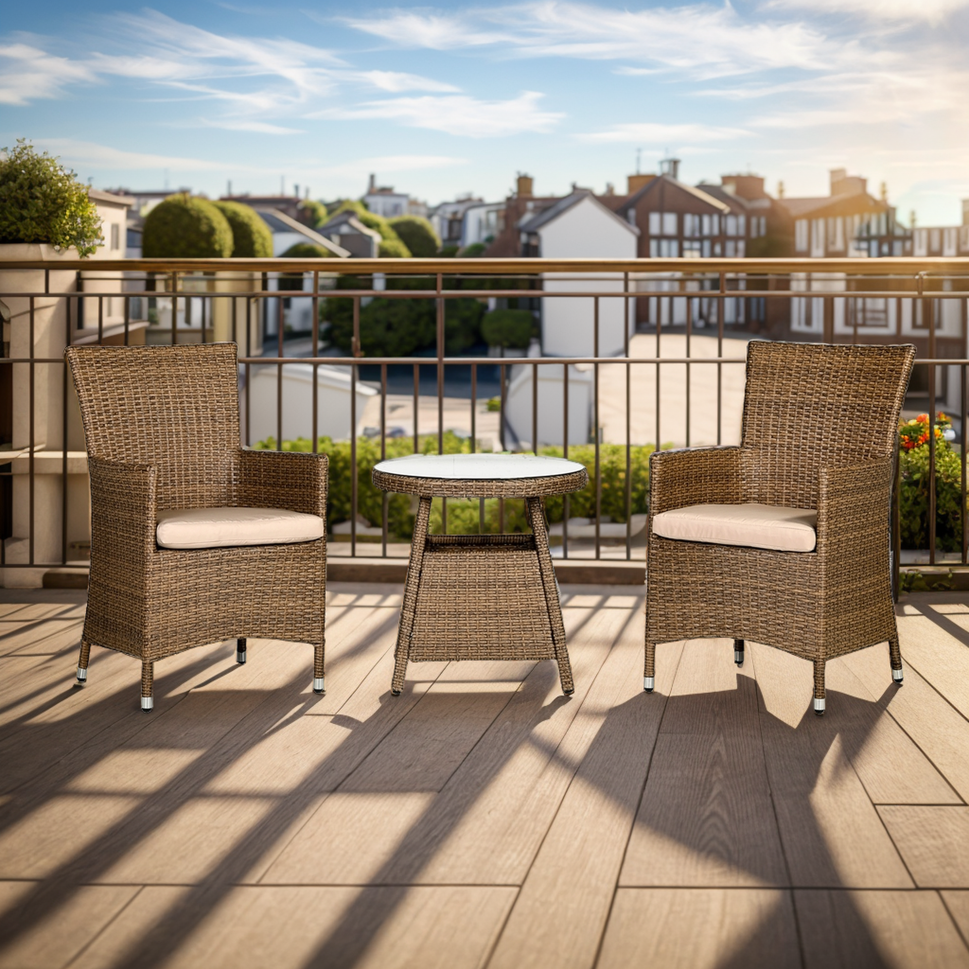With a natural brown rattan that provides a modern look, this stylish bistro set will look fabulous in any garden. The chairs can also be used as dining chairs alongside our corner sofa with dining table sets in the same matching rattan. Our plush beige cushions are of premium quality, ensuring you the utmost comfort for you to sit back and soak up the cosy warmth of the sun until it disappears behind the horizon. Underneath the 6mm tempered glass top is a fully weaved table for a smooth, luxury look. Whilst the table requires a little bit of easy self-assembly, the chairs are fully assembled for your own convenience. Find that sun trap and enjoy a nice drink! With over two decades of experience, we’ve dedicated our time to not only sourcing the best materials but extensively developing our stylish models. |