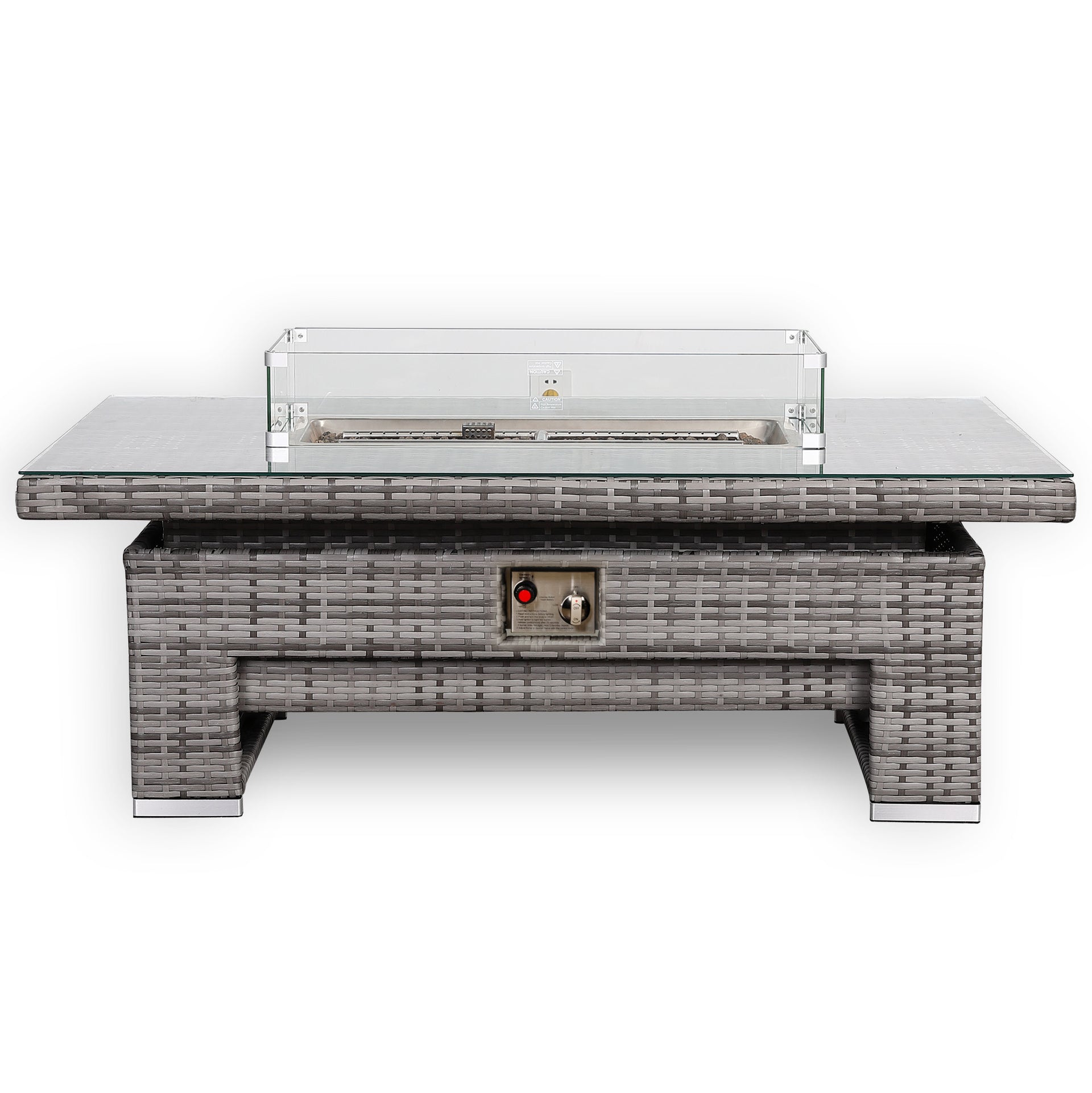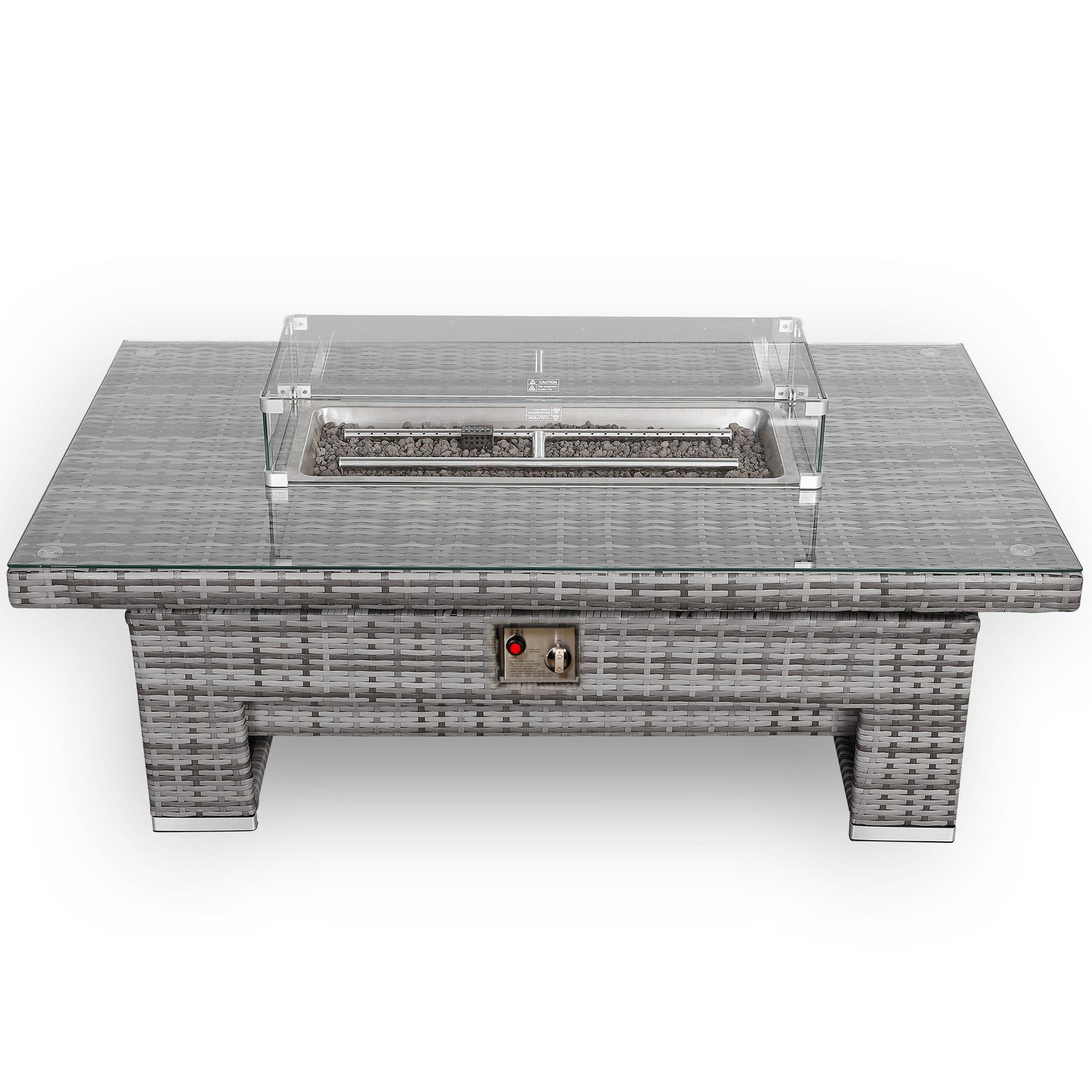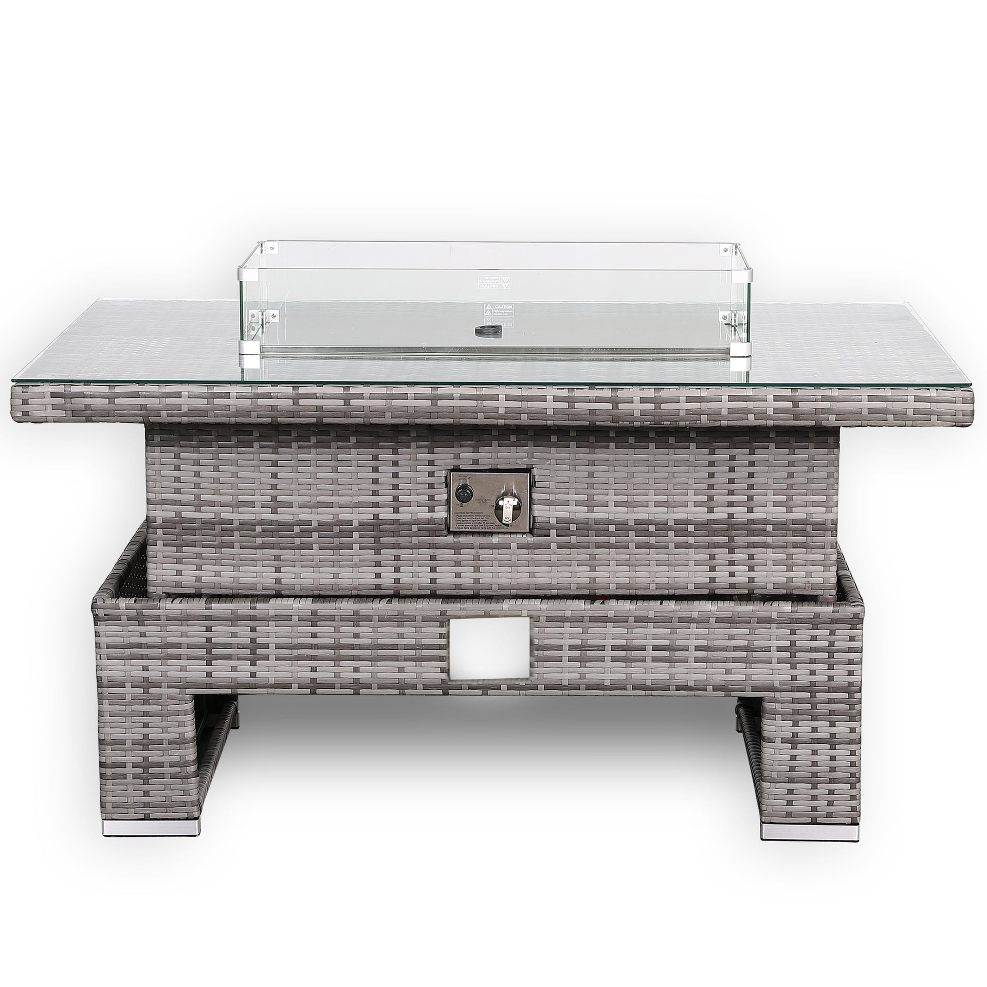 This stylish outdoor furniture set is an eye-catching addition to any garden or terrace. It’s made in our small grey rattan and flame intensity is adjustable, equipped with a knob to adjust the firepower to meet different needs. With over two decades of experience, we’ve dedicated our time to not only sourcing the best materials but extensively developing our stylish models. 55,000 BTU burner, with smokeless fire pit: Clean burn, helps to retain the warmth longer. Electronic ignition system to start, with flame adjustment knob. Safe & Easy Flame Control: Built - in push - button ignition and adjustable flame knob let you customize heat with ease. The tempered glass wind guard shields flames for steady, smokeless burns. Care for your Furniture. The Rattan Furniture is hand woven, so no two pieces are identically the same, so one section can vary from the other which has no impact on its durability. The Rattan may sag under the glass in hot condition direct sunlight The Staple fixing, screws and bolts & welds can develop a film of rust in damp conditions. The frames of our sets are coated for optical reasons. The coating is sometimes minimally damaged in the production process. This doesn't affect the quality or durability of the frame in any way.
