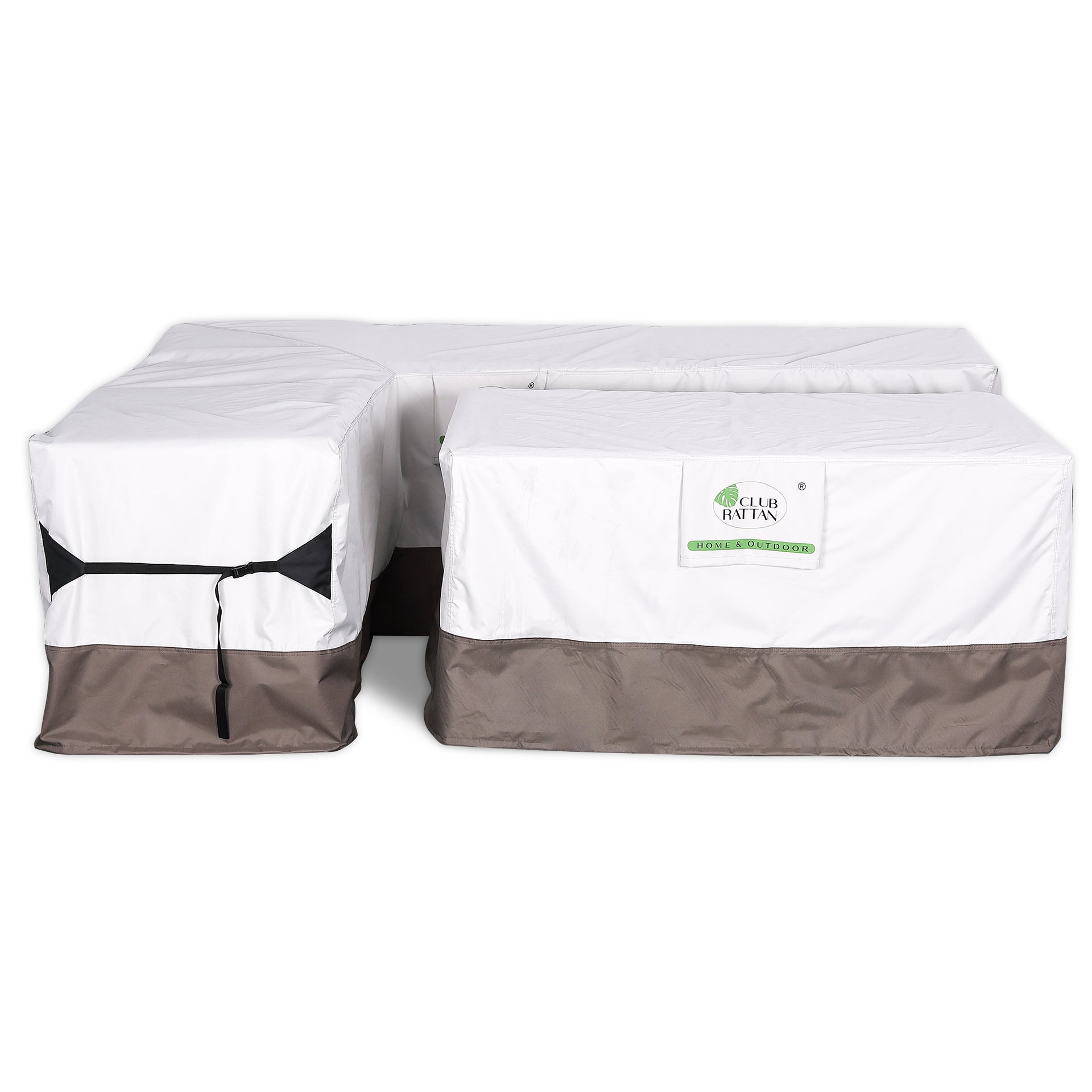 Each set comes with 2 covers to individually cover the corner sofa and the dining table. Over winter, the stools fit neatly on their side on each of the sofa sections underneath the covers.