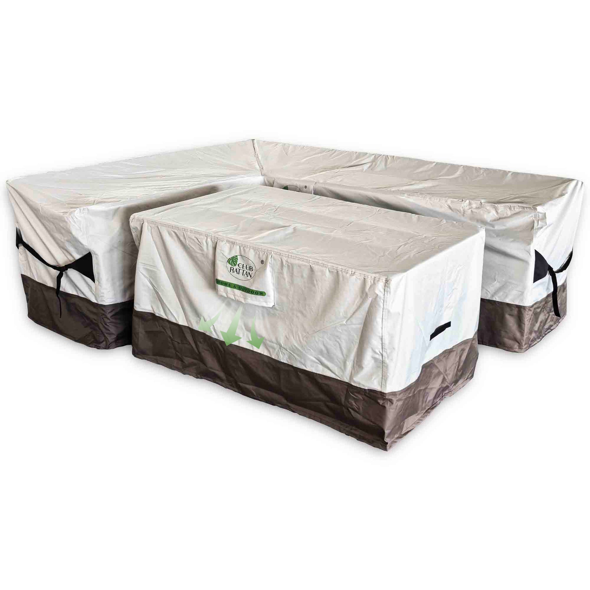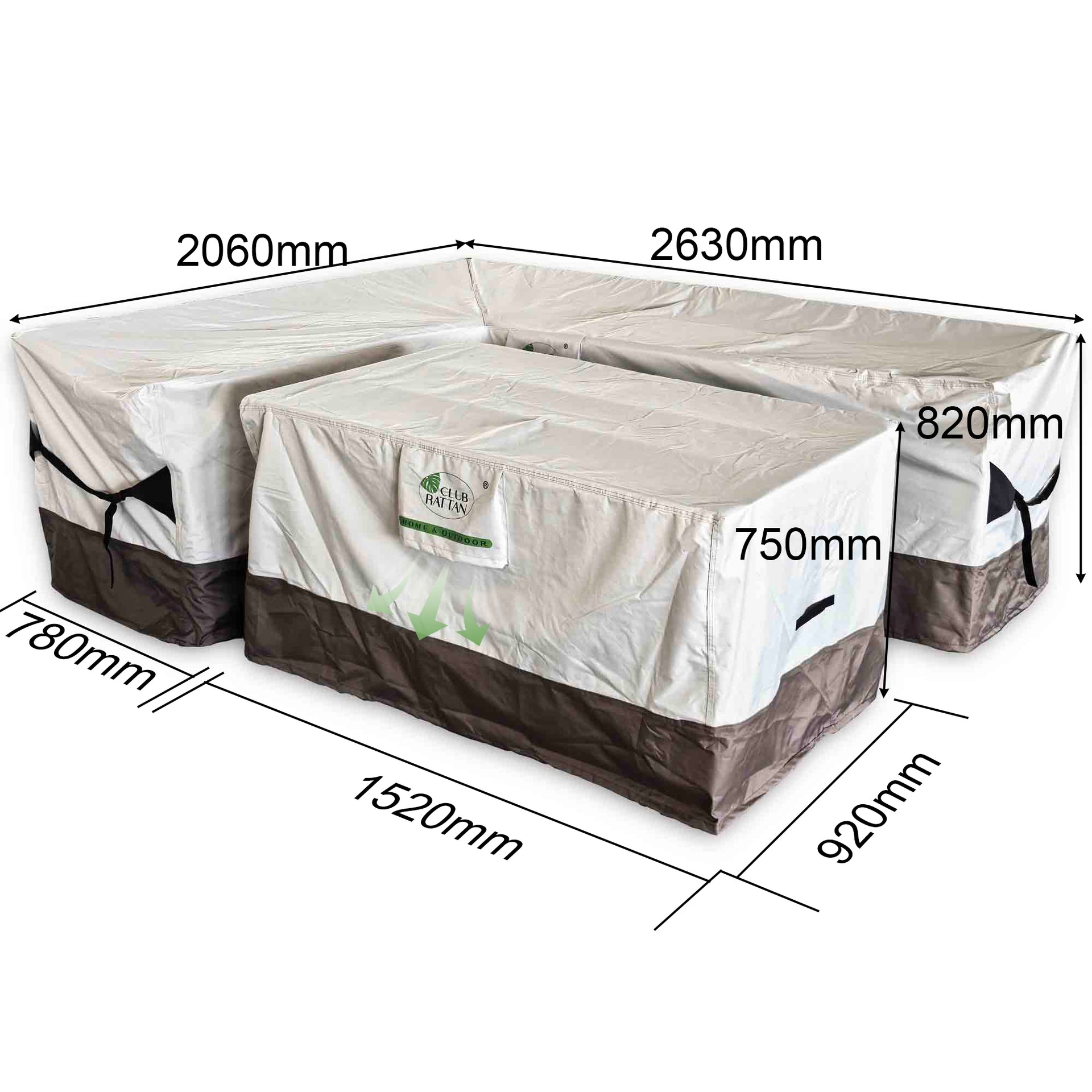 Each set comes with 2 covers to individually cover the corner sofa and the dining table. Over winter, the stools fit neatly on their side on each of the sofa sections underneath the covers.