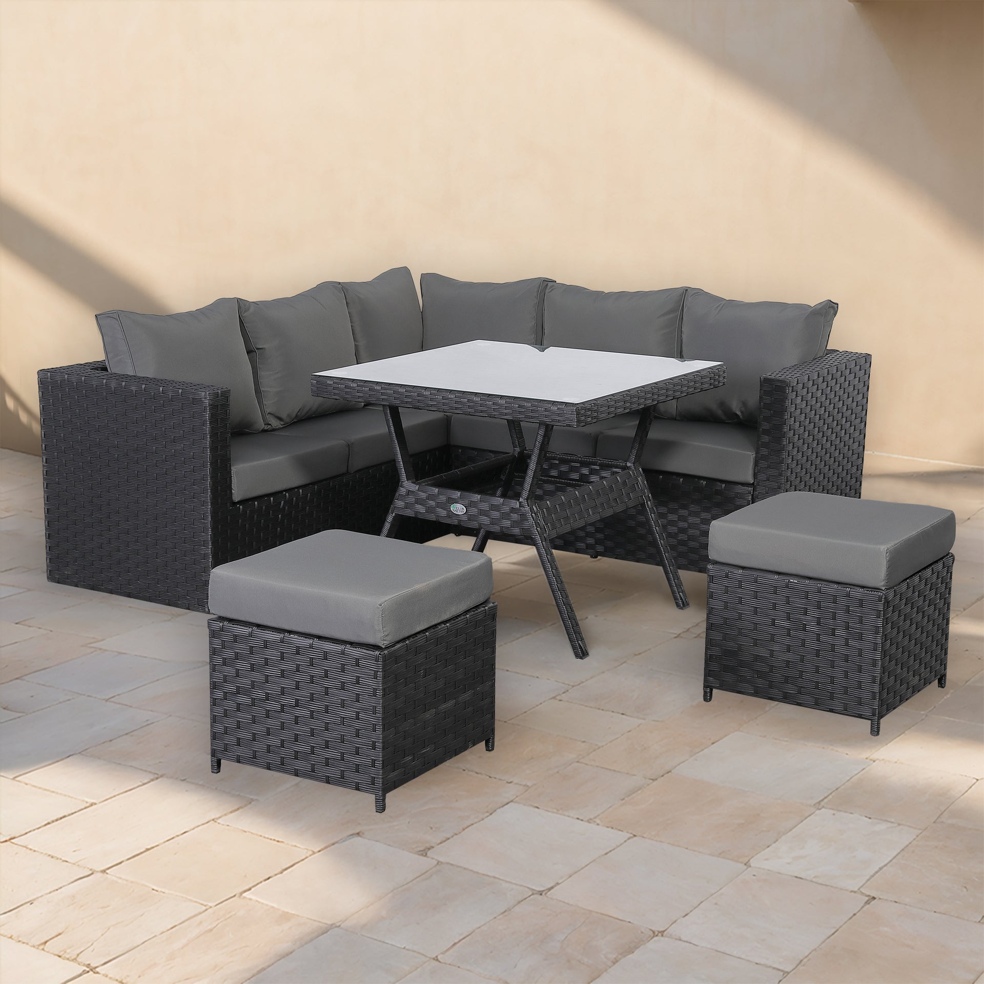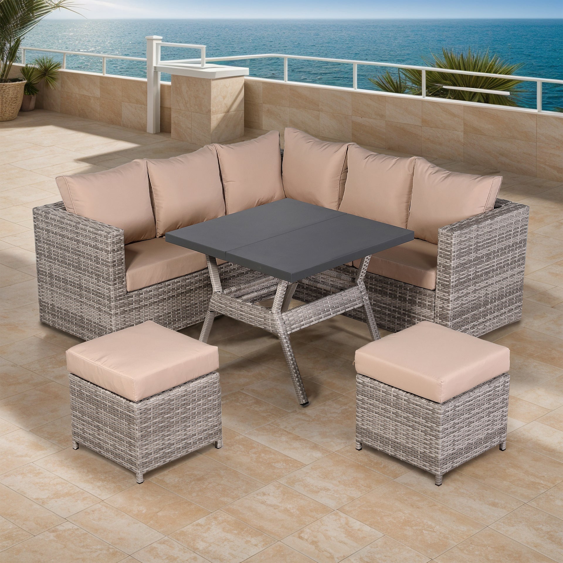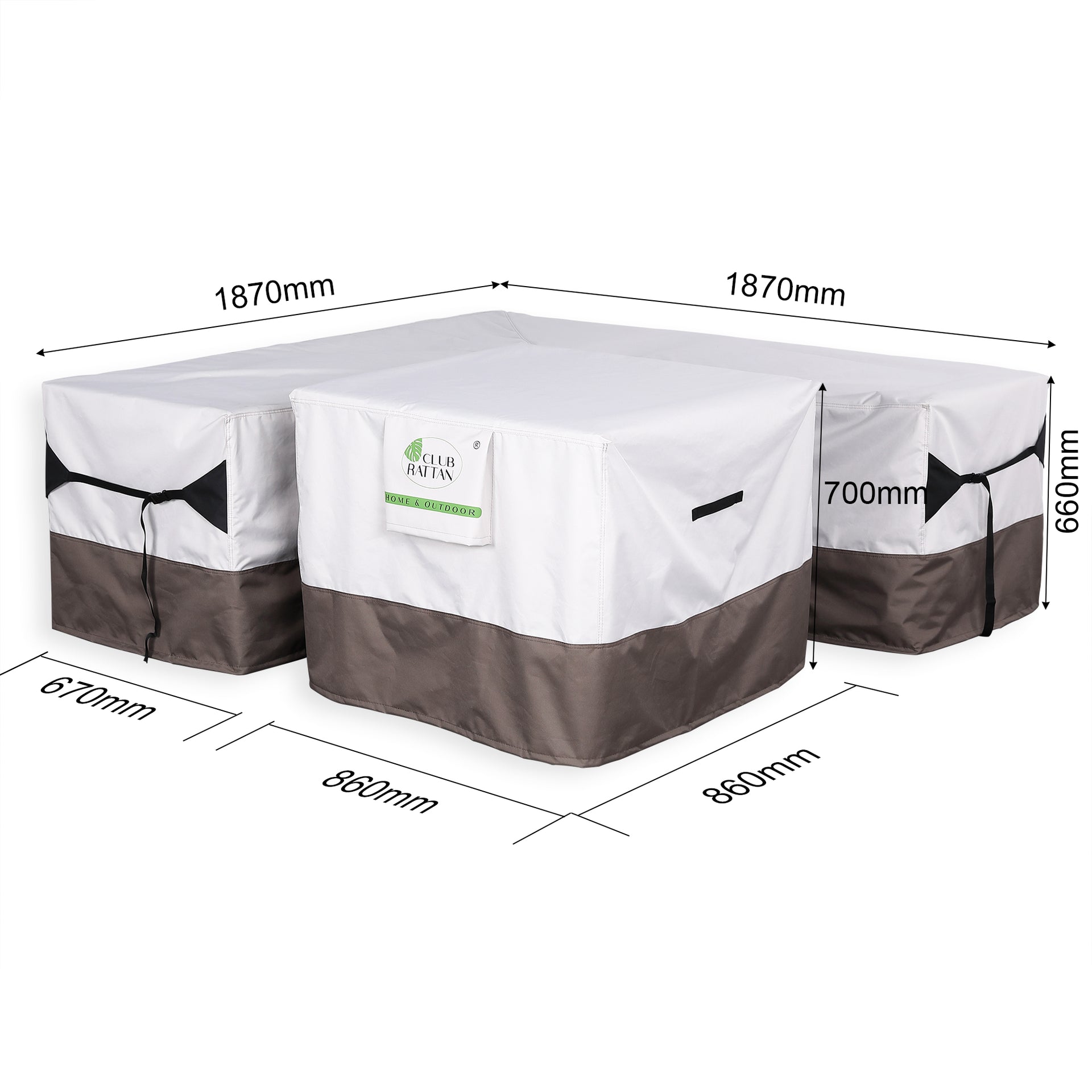 Each set comes with 2 covers to individually cover the corner sofa and the table. Over winter, the stools fit neatly on their side on each of the sofa sections underneath the covers.