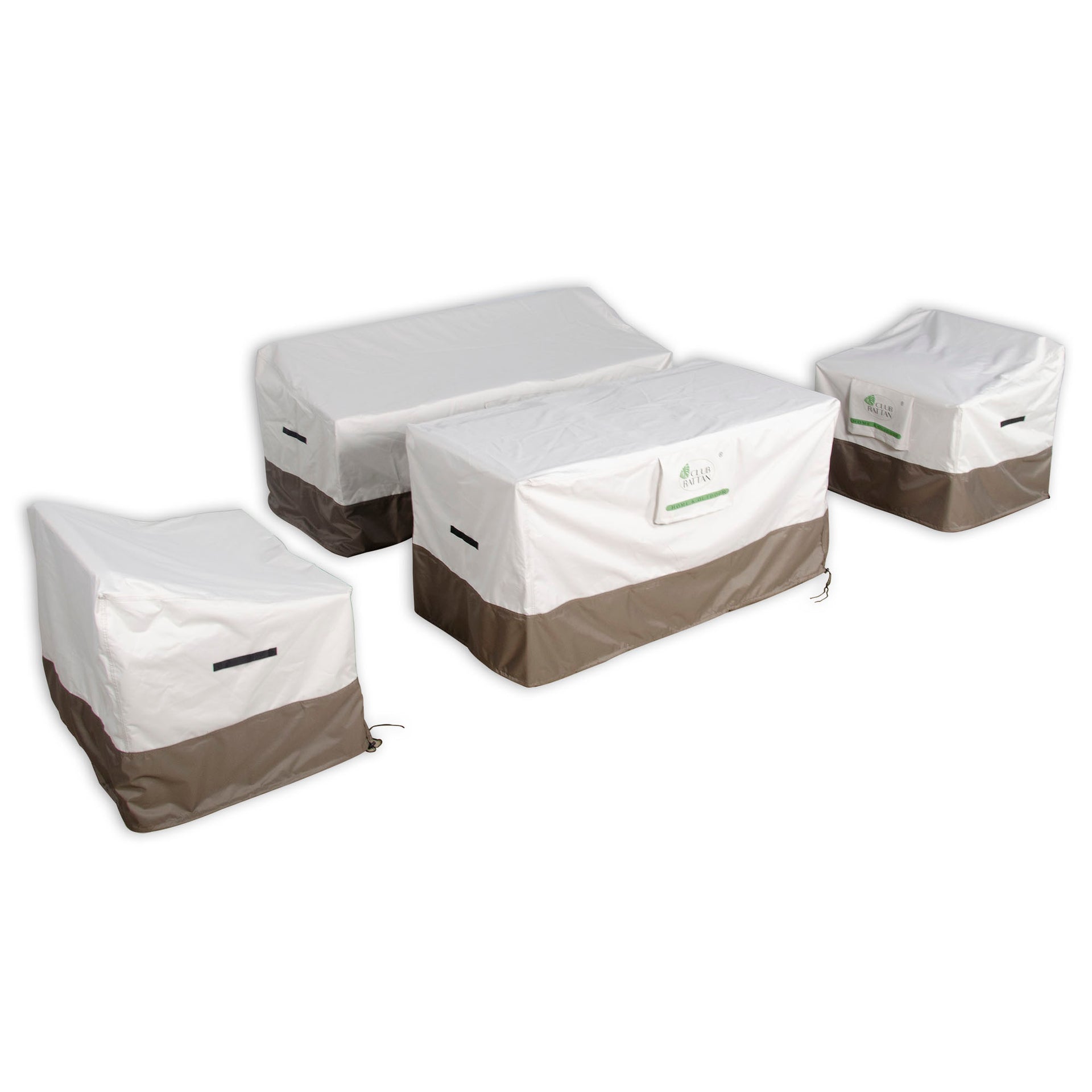 Each set comes with 4 cover to cover the individually cover the sofas and the table. Over winter, the stools fit neatly on their side on each of the sofa sections underneath the covers.