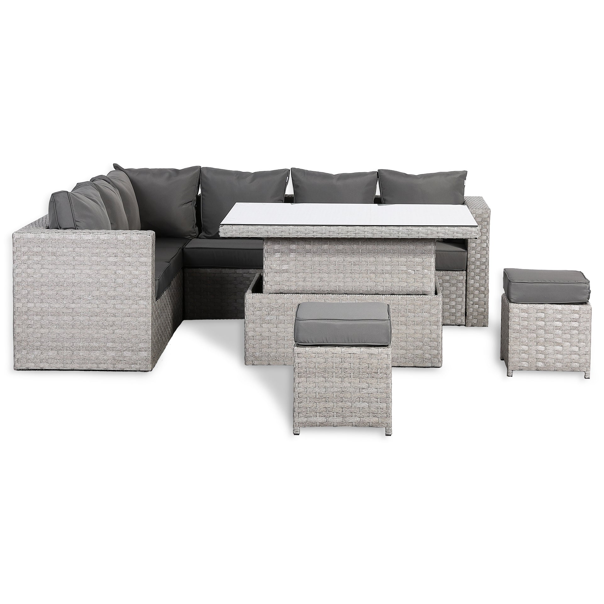 The table of this modern corner sofa set can be raised or lowered to a dining or coffee tables and sits 8 people comfortably. The table has a full weave underneath the 5mm tempered glass adding to the luxurious look of this fantastic garden set. To make it easy for you: the table top needs to be attached and One arm for the Corner but the rest of the set is fully assembled. Now sit down and enjoy... maybe with an ice cold glass of white wine? |