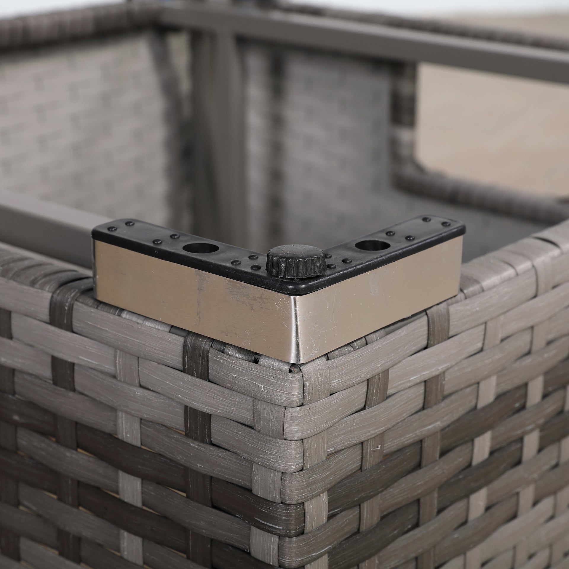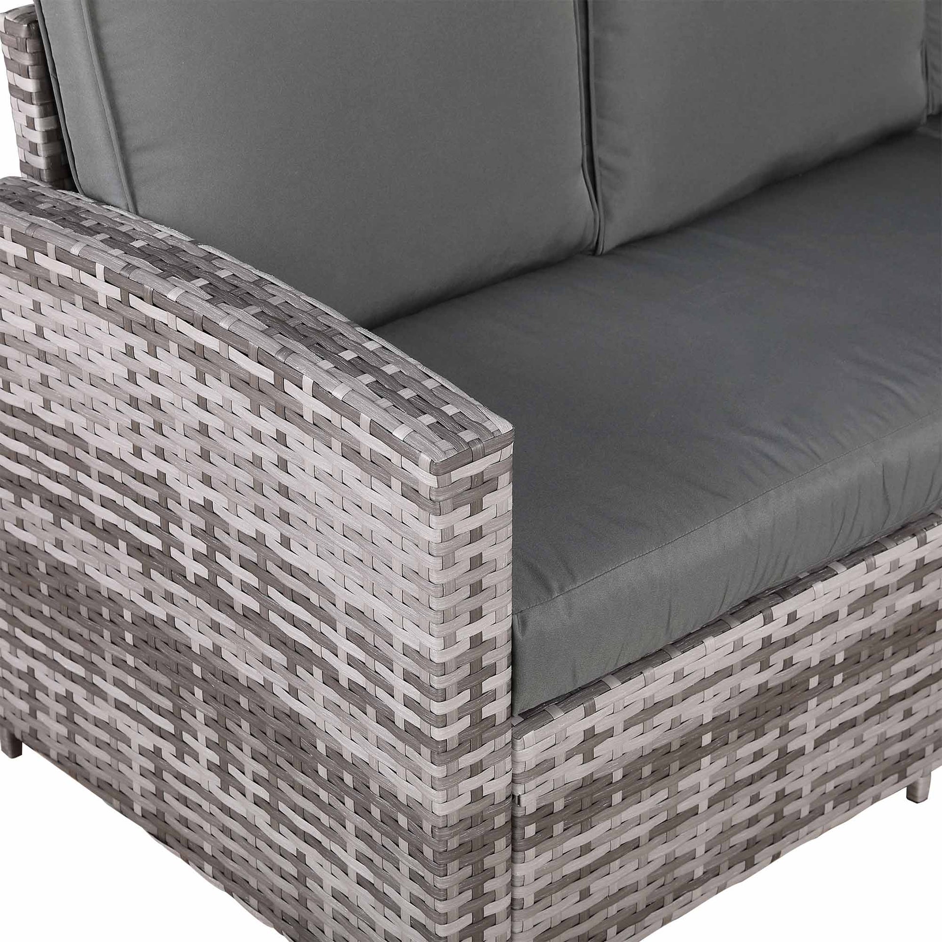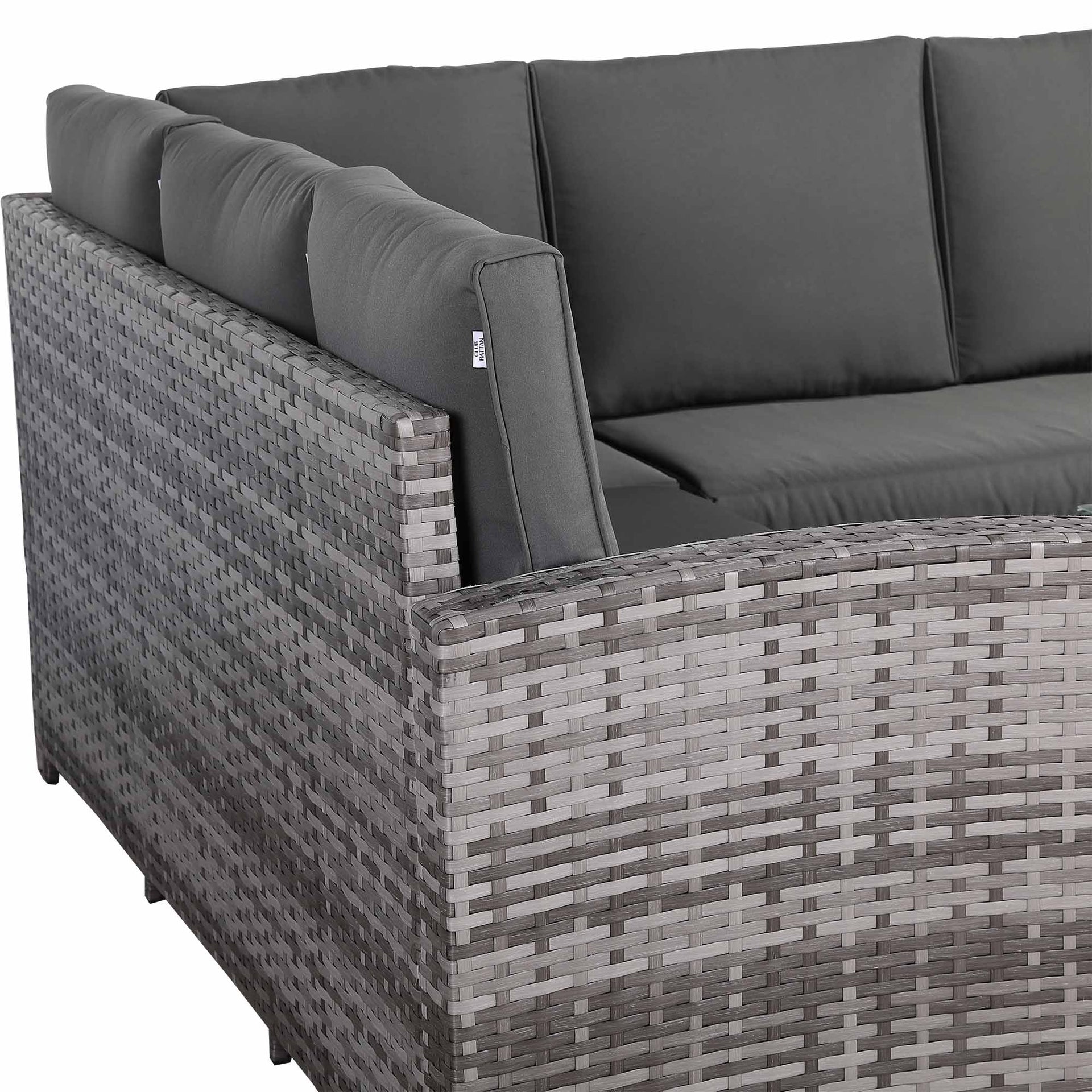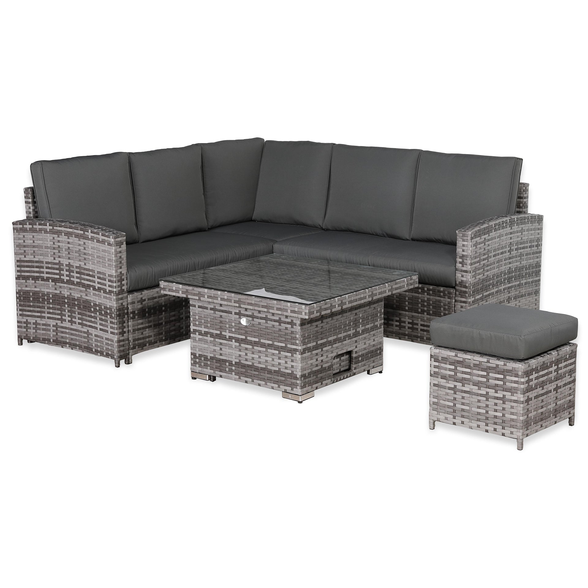 This classic high back compact corner sofa set with rising table sits 6 people properly . It’s made in our premium dark grey rattan that will withstand our British weather of rain, wind and sun. The dark grey cushions are super thick with solid foam insert and comfortable. Now sit down and enjoy... maybe with a nice cold one? |