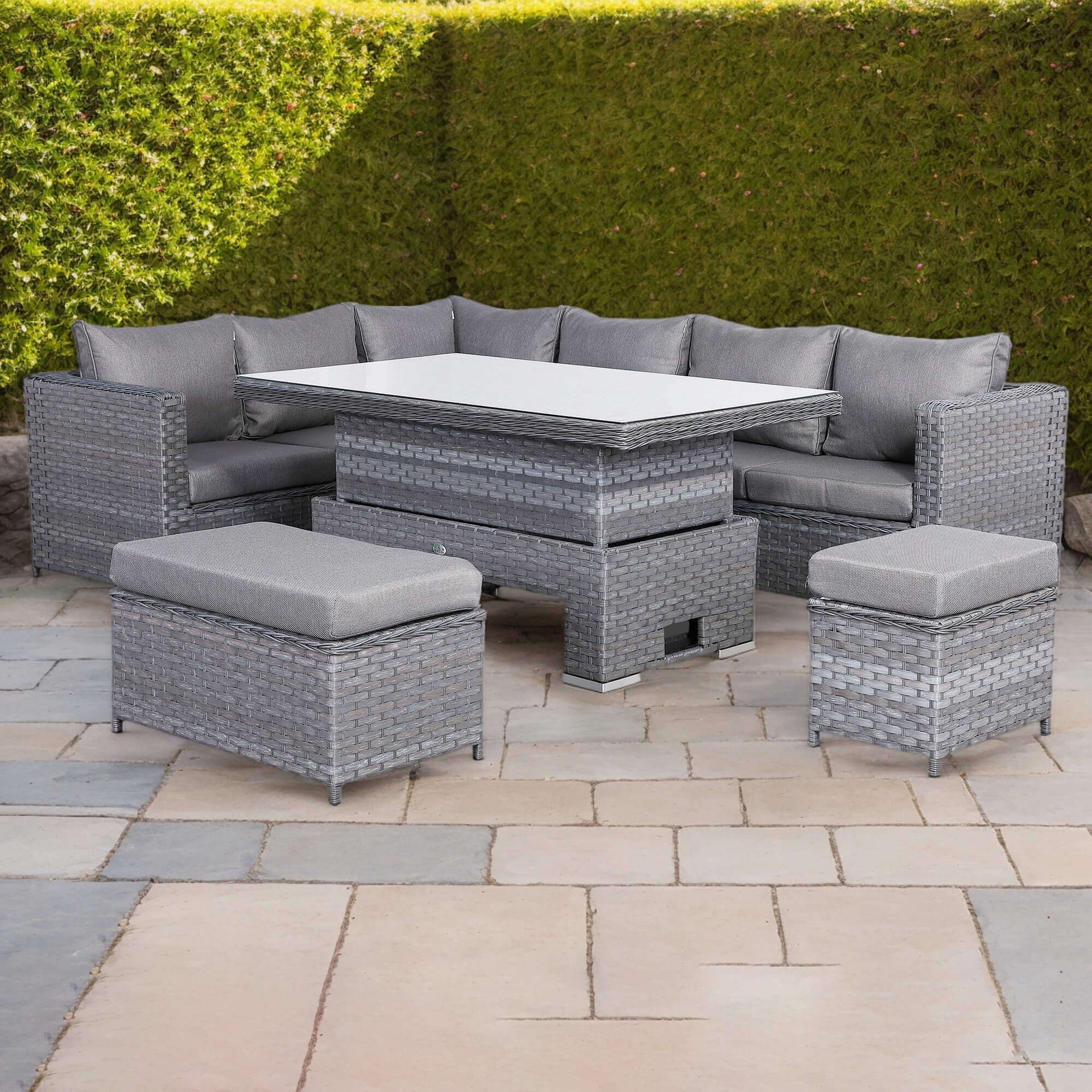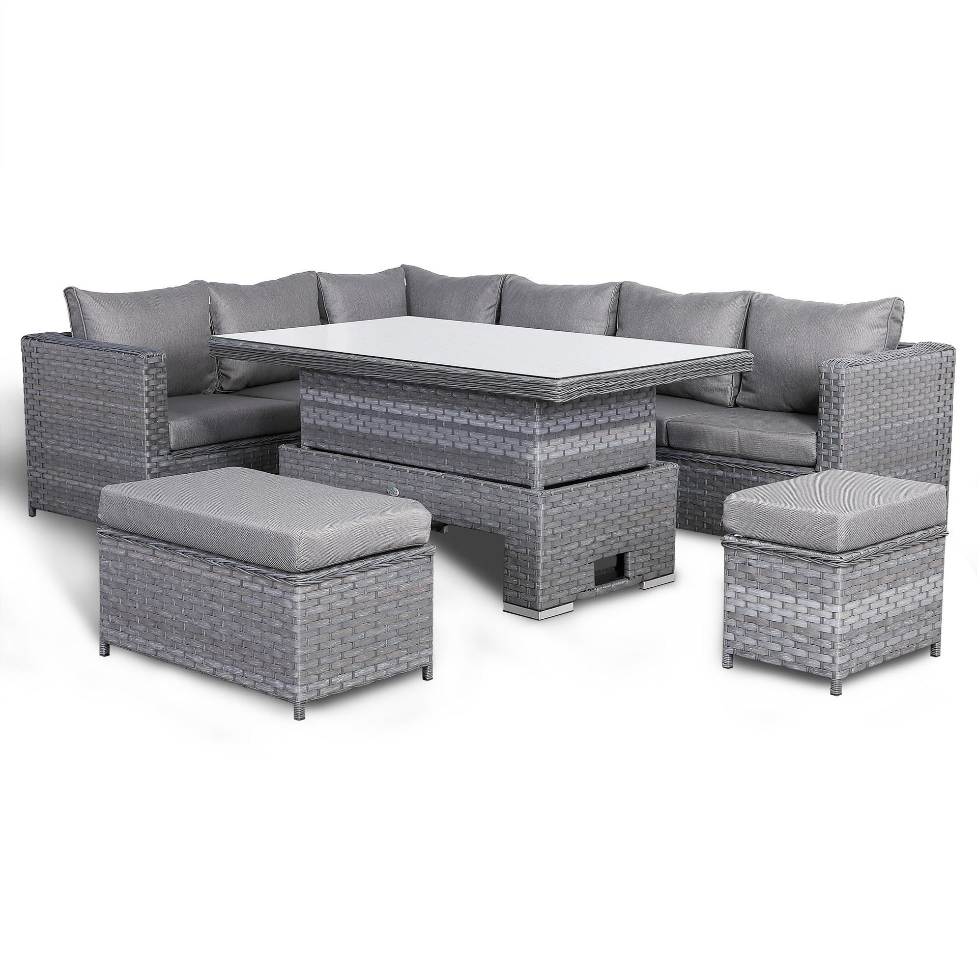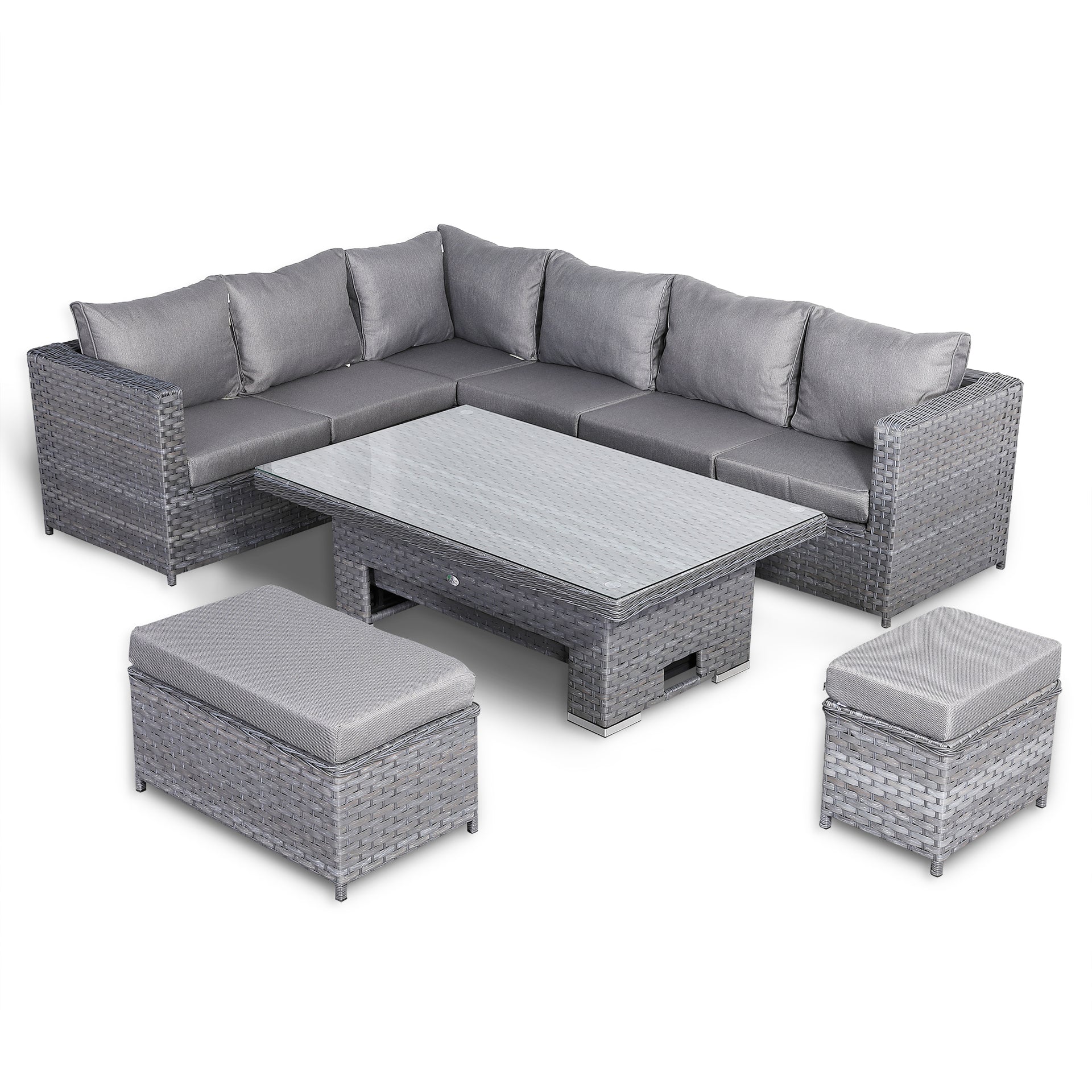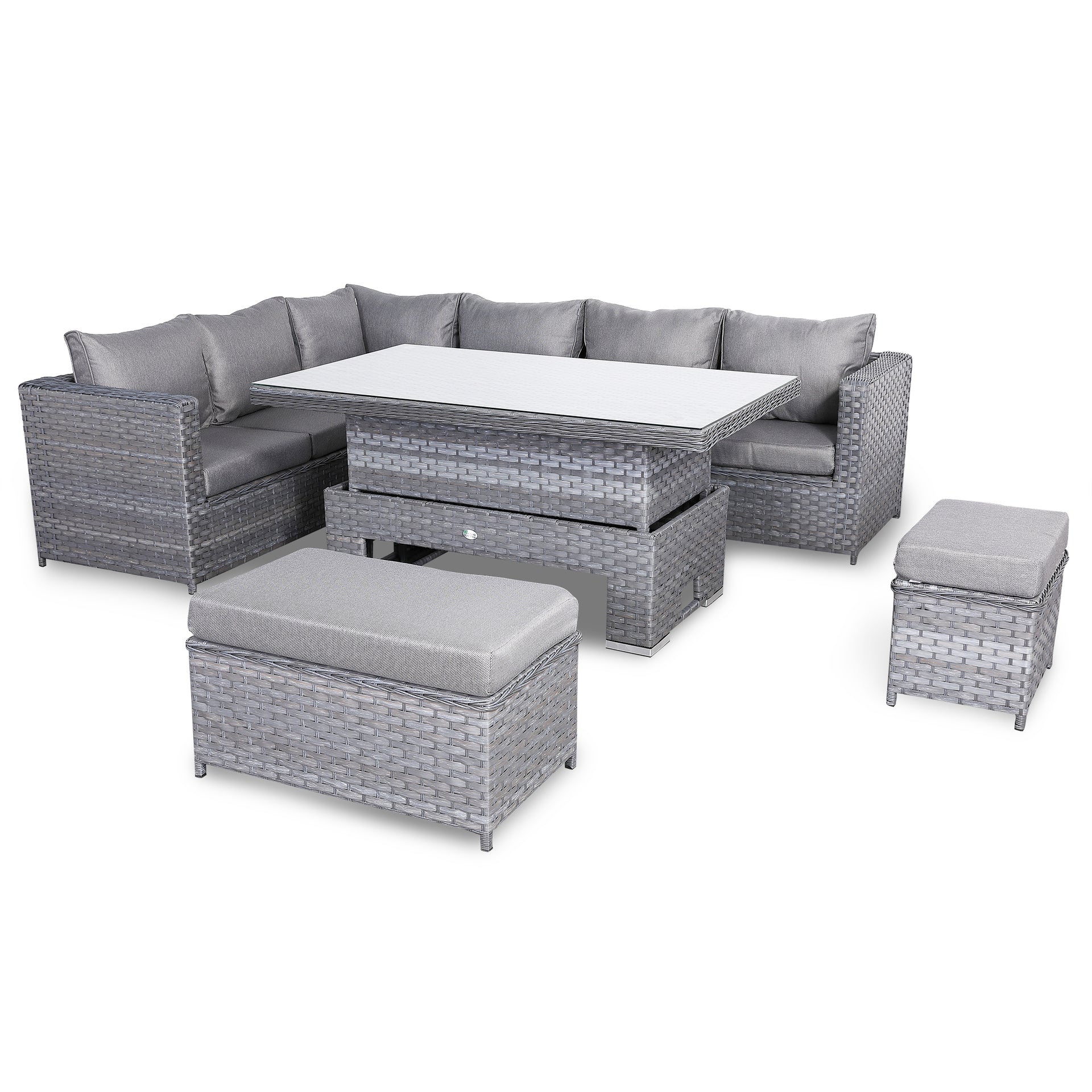 This LHF large corner sofa set sits 9 people comfortably and is made in our premium Slate Grey rattan that is UV Treated. The rising table can be used as either a coffee or dining table. The grey cushions are premium quality and have machine washable covers. |