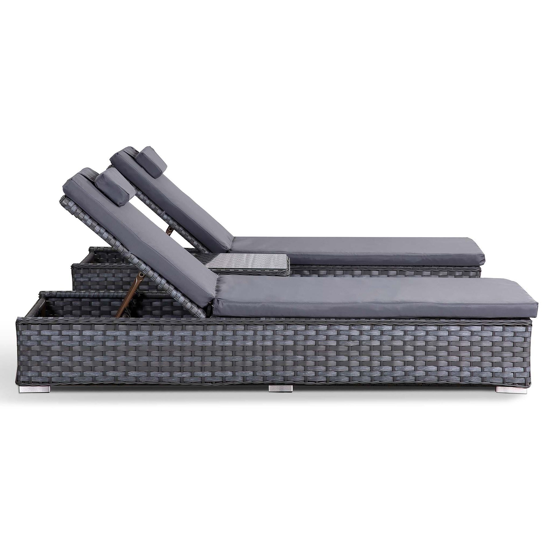 These two stunning contemporary style Sun Loungers with Side Table will compliment any garden. They come in our premium wide grey rattan. The grey cushions are super comfortable and will make sure you'll spend many a lazy weekend not wanting to leave your garden. The side table has a full weave underneath the glass for a luxury look. You can of course lie flat to “soak” up the sun and then position the back rest upwards in five positions to enjoy your cold drink. The pillow headrests are also a great feature. The set is fully assembled, so you only have to take them out of the box and... relax! With over two decades of experience, we’ve dedicated our time to not only sourcing the best materials but extensively developing our stylish models. Care for your Furniture. The Rattan Furniture is hand woven, so no two pieces are identically the same, so one section can vary from the other which has no impact on its durability. Glass tops - A Magnifying glass effect caused by Glass, objects ( Bottles, drinking Glasses, spectacles etc) can have an effect on the rattan due to the heat from magnification which leads to the rattan melting and going over its temperature range and will go brittle and snap . We recommend shading from direct sun light. ( Parasol- Gazebo etc) The Rattan may sag under the glass in hot condition direct sunlight which reforms back to normal when it's cooled back down. The Staple fixing, screws and bolts & welds can develop a film of rust in damp conditions. The frames of our sets are coated for optical reasons. The coating is sometimes minimally damaged in the production process. This doesn't affect the quality or durability of the frame in any way. |