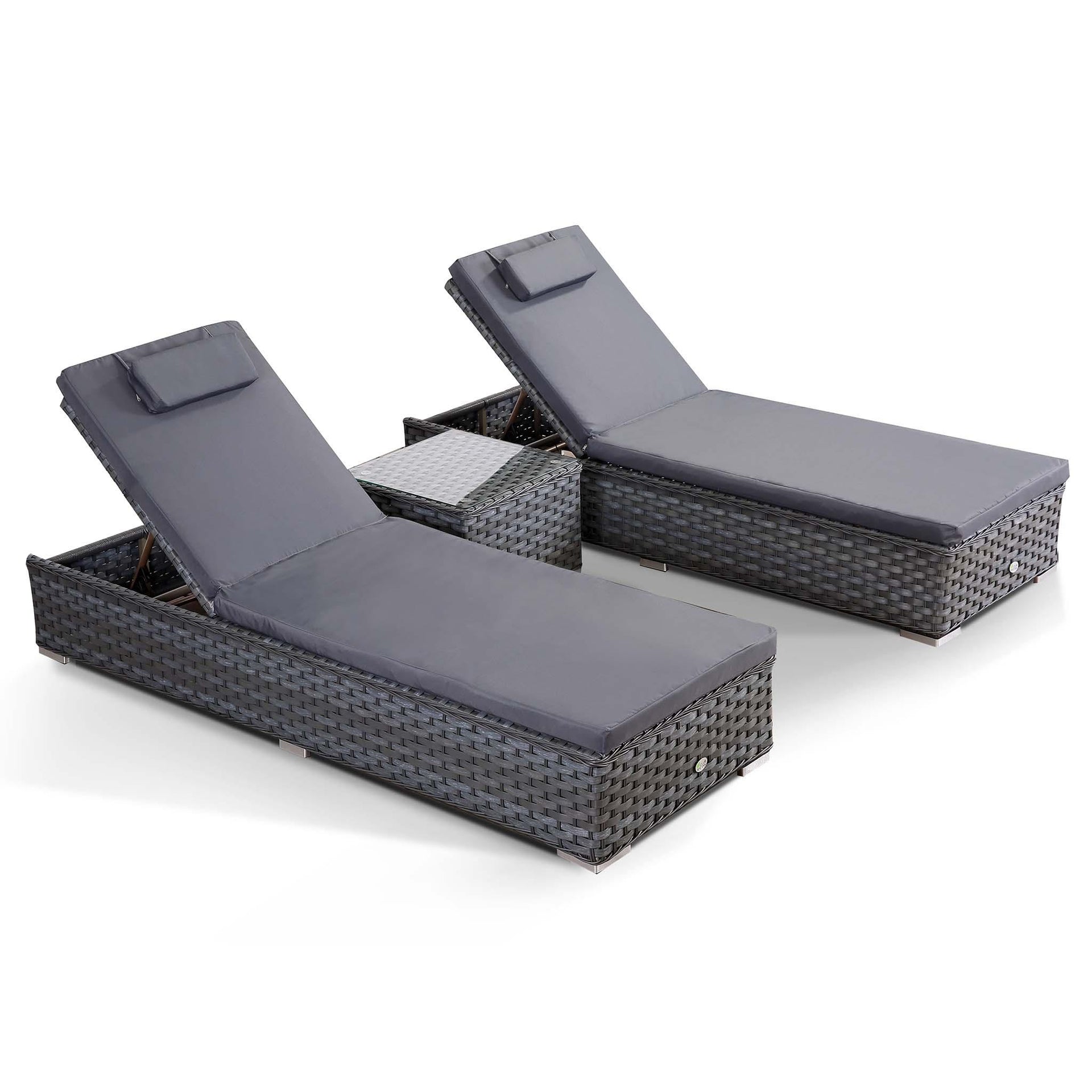 These two stunning contemporary style Sun Loungers with Side Table will compliment any garden. They come in our premium wide grey rattan. The grey cushions are super comfortable and will make sure you'll spend many a lazy weekend not wanting to leave your garden. The side table has a full weave underneath the glass for a luxury look. You can of course lie flat to “soak” up the sun and then position the back rest upwards in five positions to enjoy your cold drink. The pillow headrests are also a great feature. The set is fully assembled, so you only have to take them out of the box and... relax! With over two decades of experience, we’ve dedicated our time to not only sourcing the best materials but extensively developing our stylish models. Care for your Furniture. The Rattan Furniture is hand woven, so no two pieces are identically the same, so one section can vary from the other which has no impact on its durability. Glass tops - A Magnifying glass effect caused by Glass, objects ( Bottles, drinking Glasses, spectacles etc) can have an effect on the rattan due to the heat from magnification which leads to the rattan melting and going over its temperature range and will go brittle and snap . We recommend shading from direct sun light. ( Parasol- Gazebo etc) The Rattan may sag under the glass in hot condition direct sunlight which reforms back to normal when it's cooled back down. The Staple fixing, screws and bolts & welds can develop a film of rust in damp conditions. The frames of our sets are coated for optical reasons. The coating is sometimes minimally damaged in the production process. This doesn't affect the quality or durability of the frame in any way. |