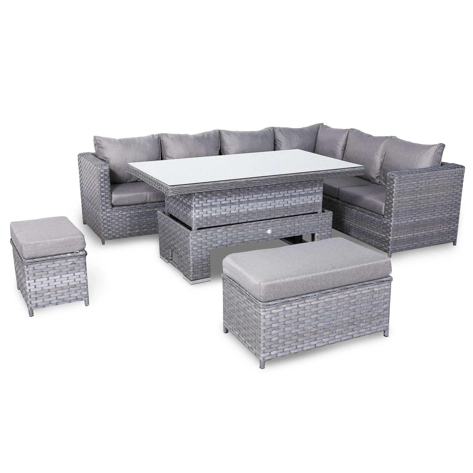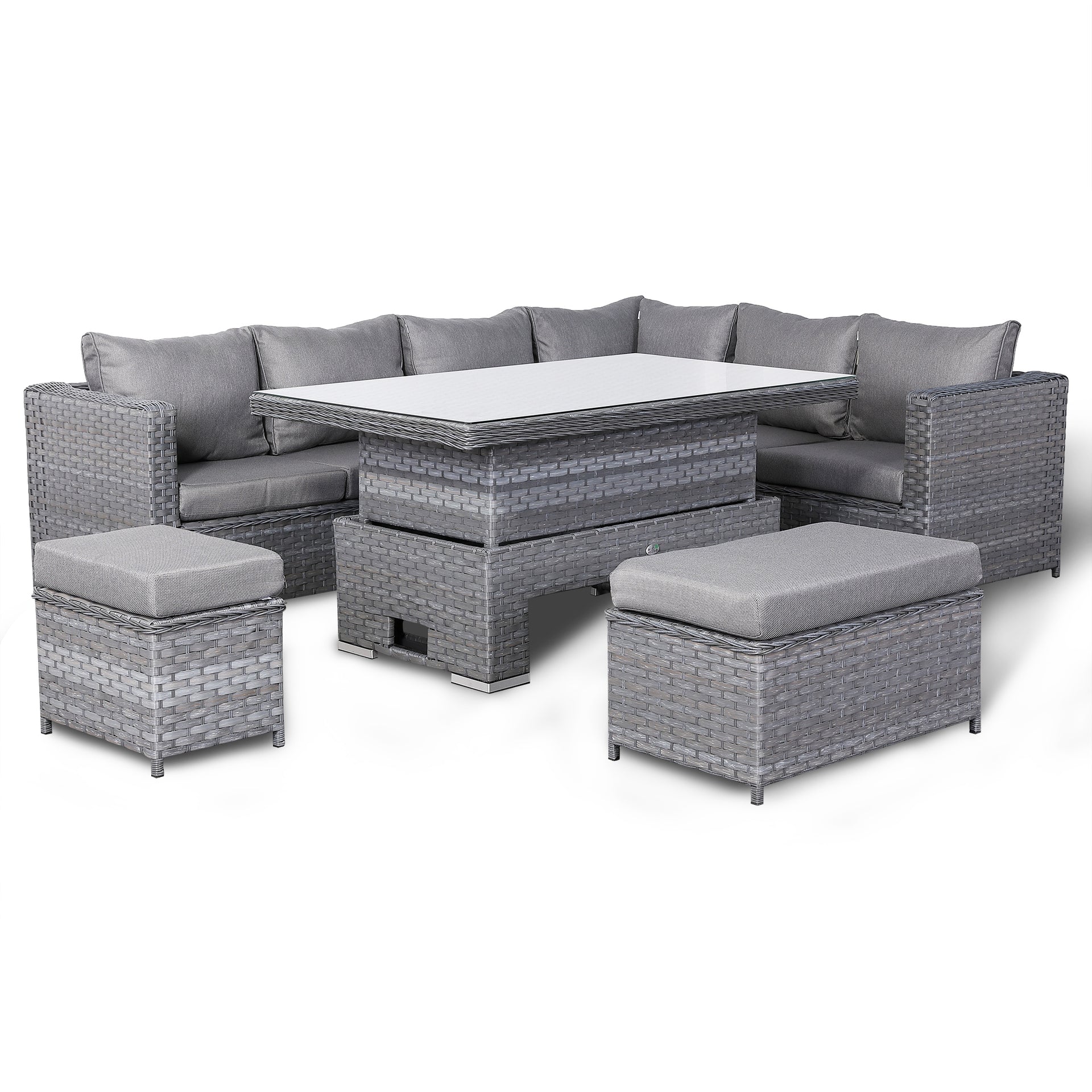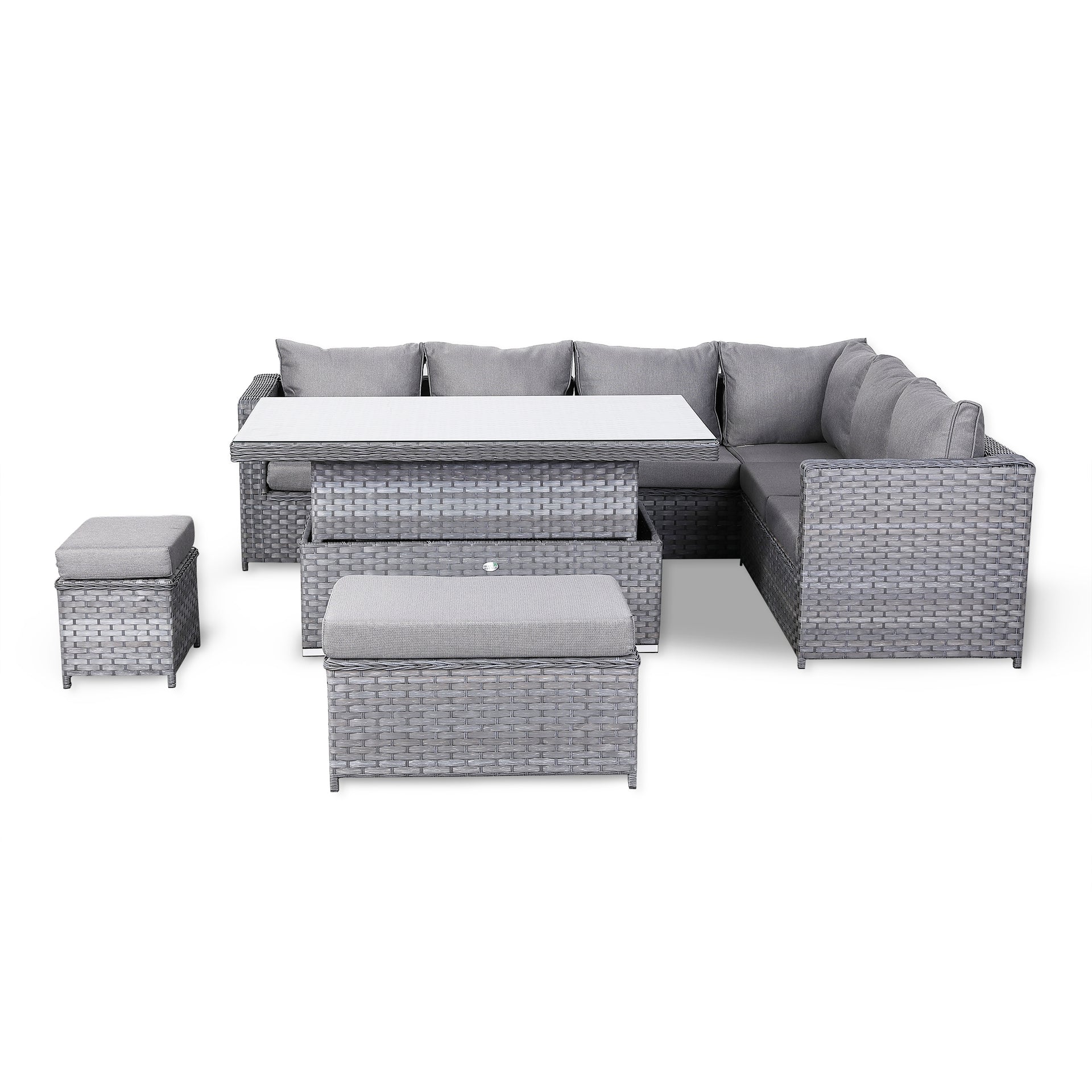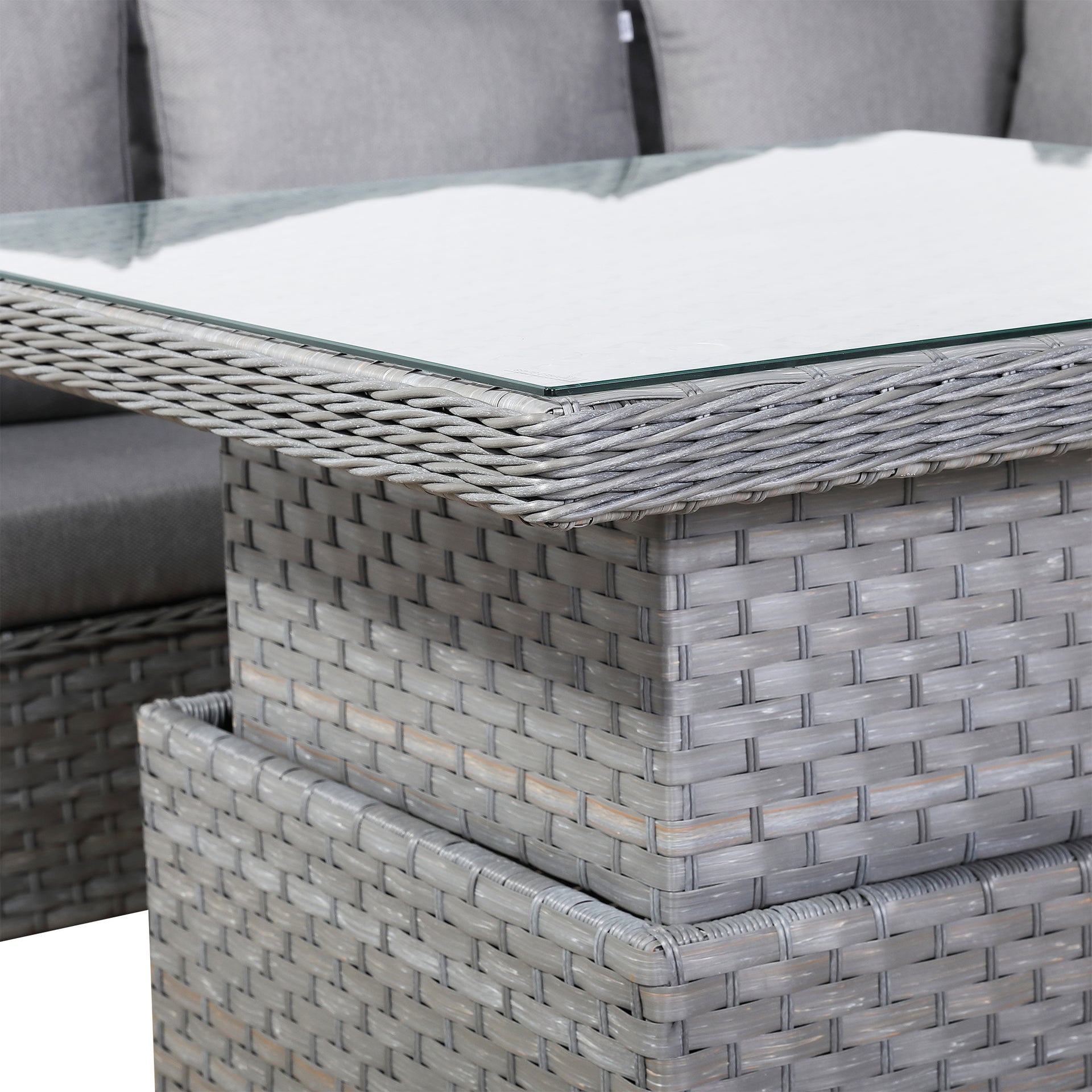 This RHF large corner sofa set sits 9 people comfortably and is made in our premium Slate Grey rattan that is UV Treated. The rising table can be used as either a coffee or dining table. The grey cushions are premium quality and have machine washable covers. |