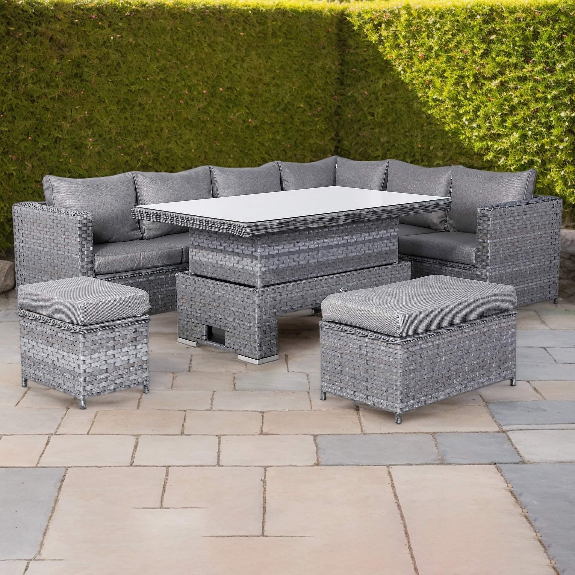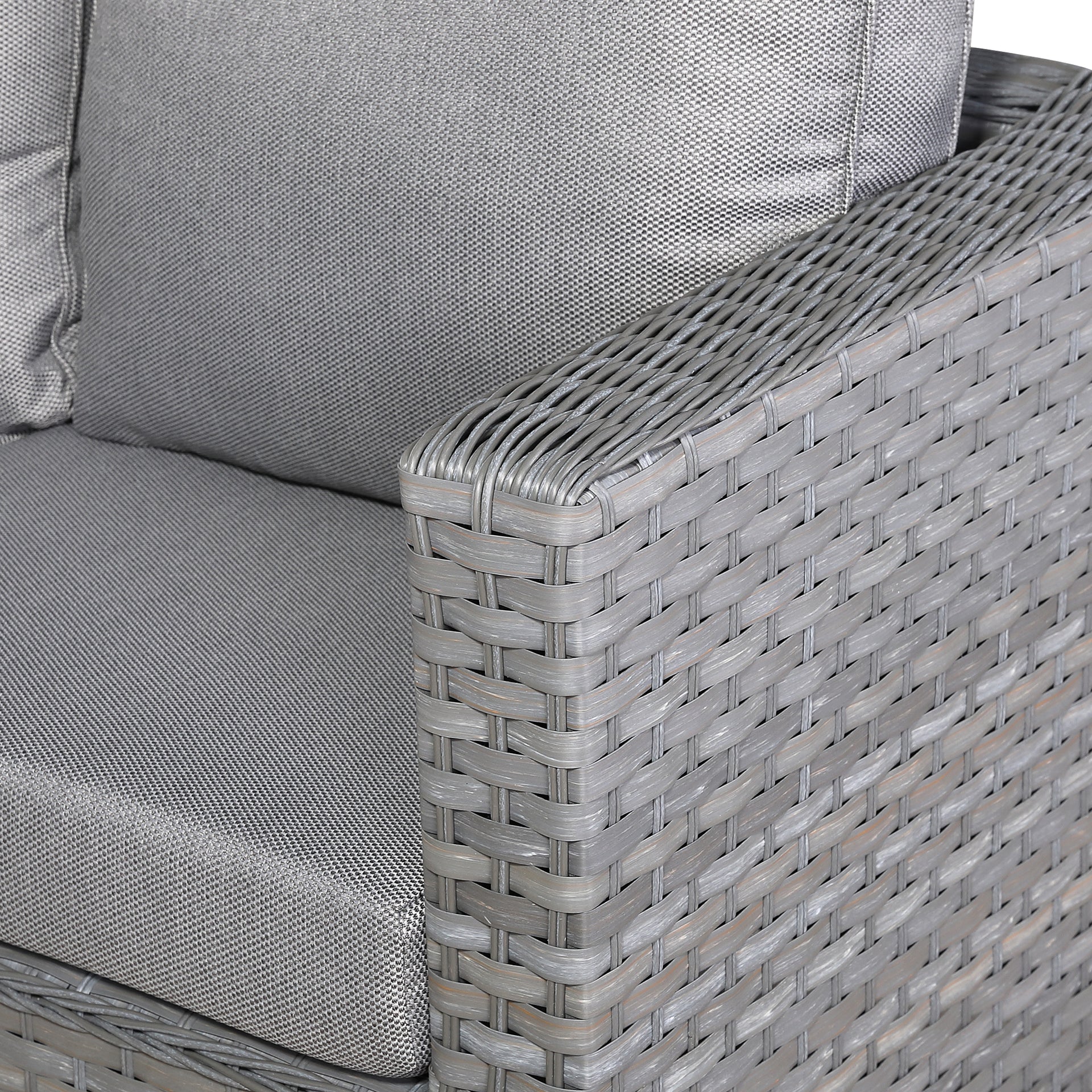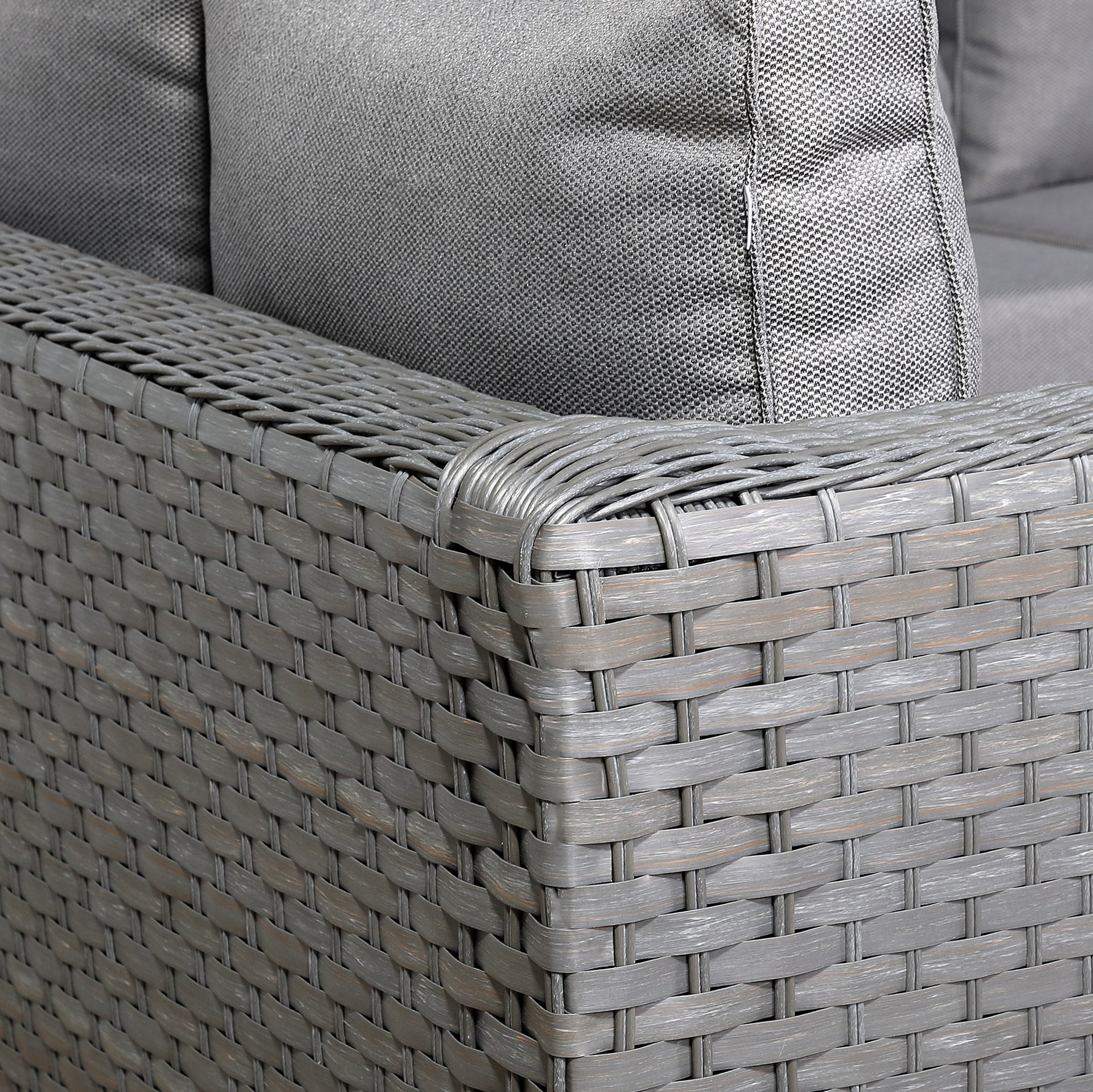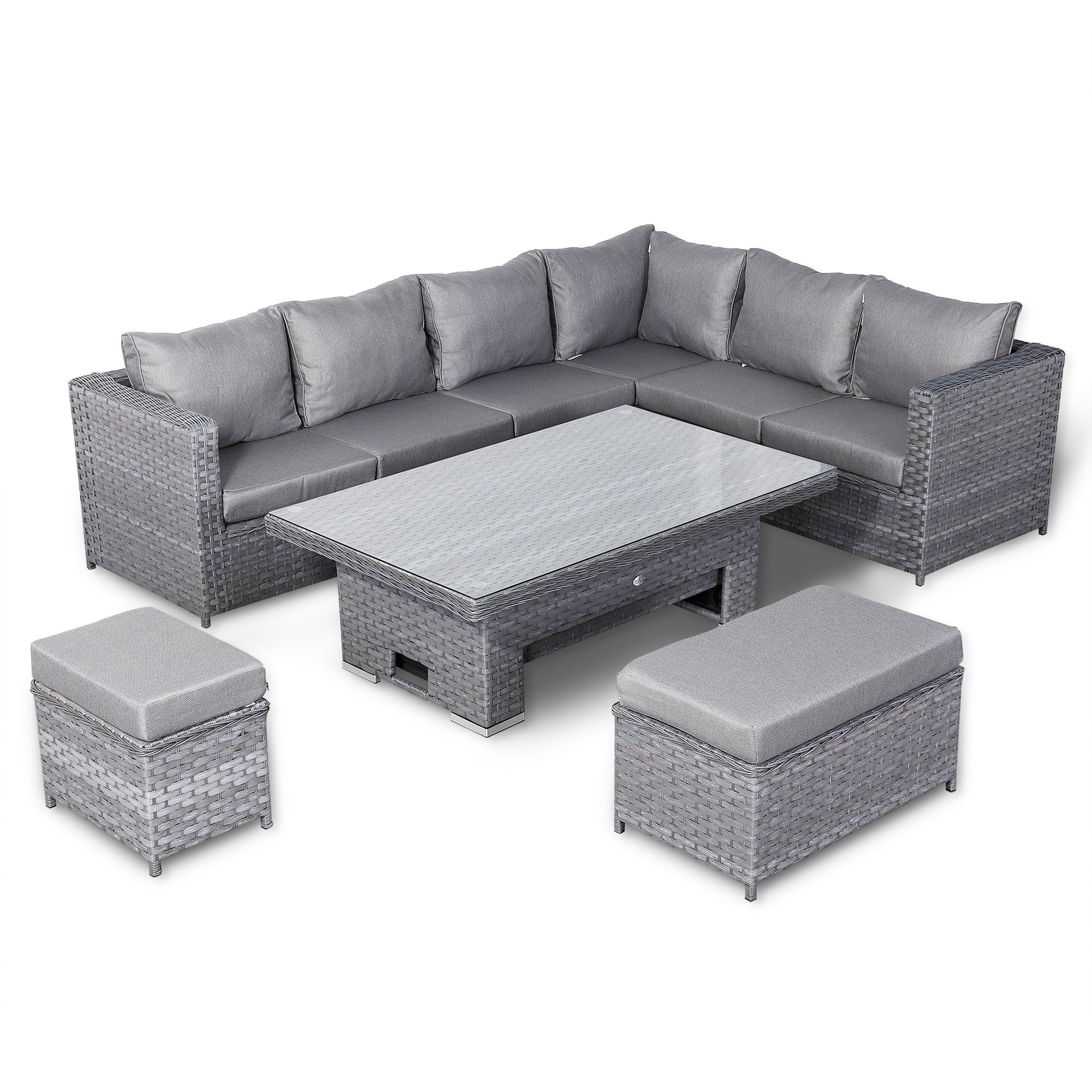 This RHF large corner sofa set sits 9 people comfortably and is made in our premium Slate Grey rattan that is UV Treated. The rising table can be used as either a coffee or dining table. The grey cushions are premium quality and have machine washable covers. |