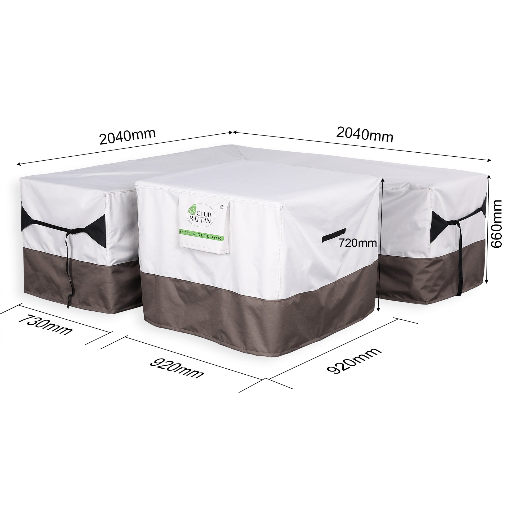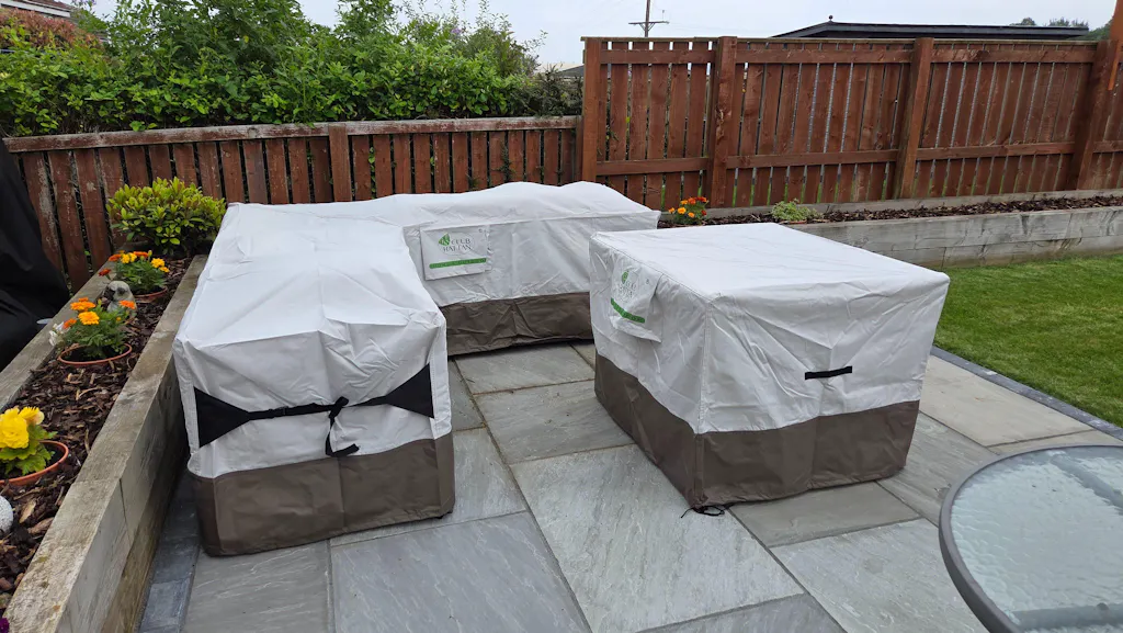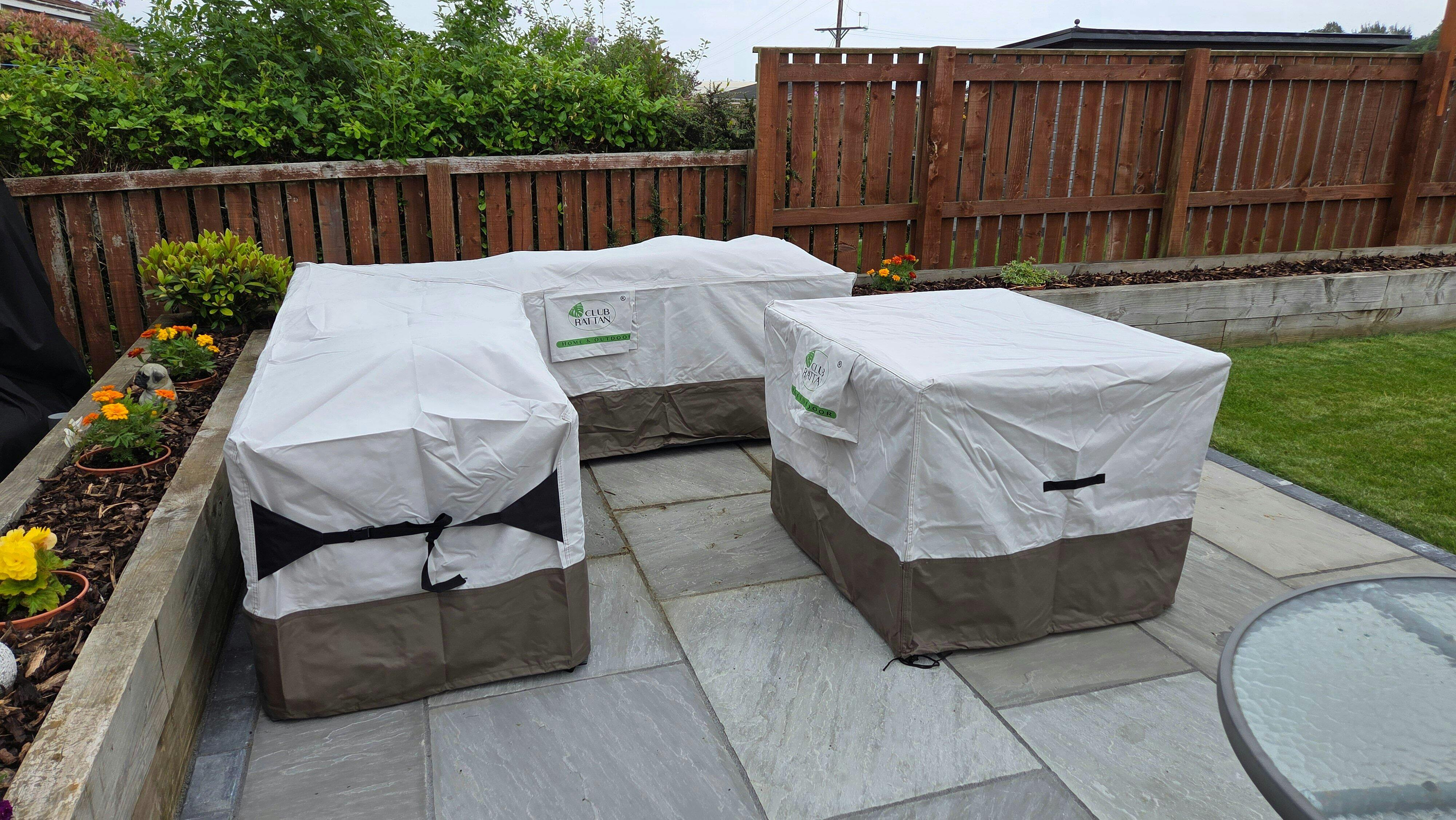 Each set comes with 2 covers to cover the corner sofa and the dining table. Over winter, the stools fit neatly on their side on each of the sofa sections underneath the covers.